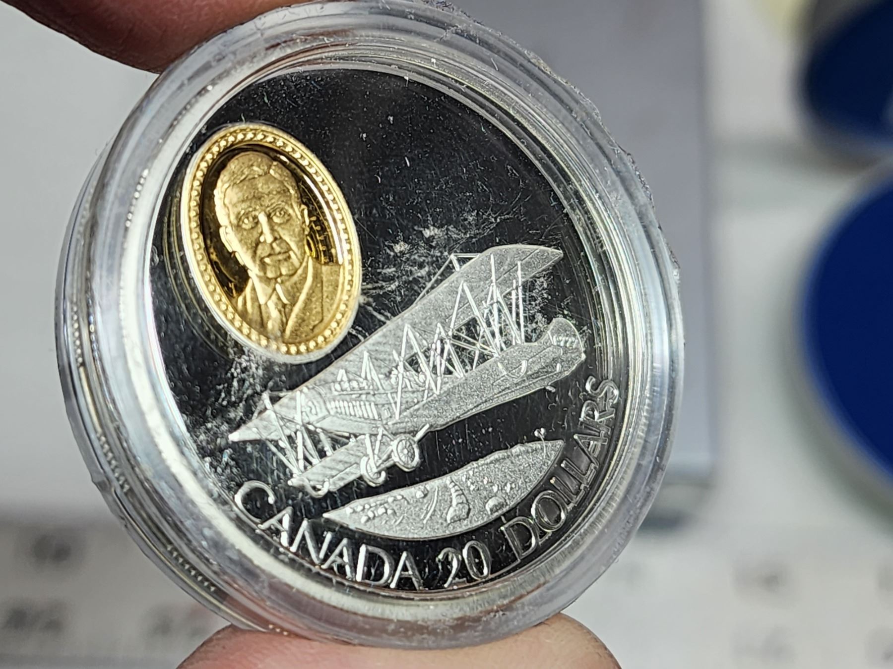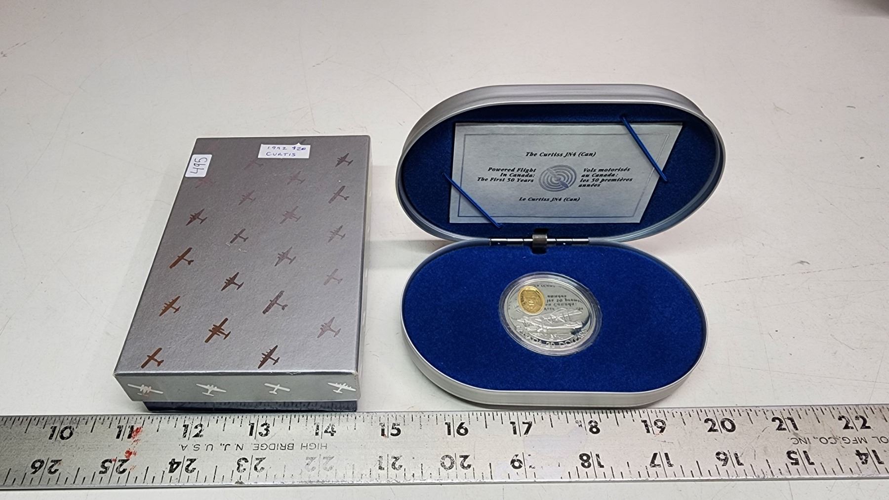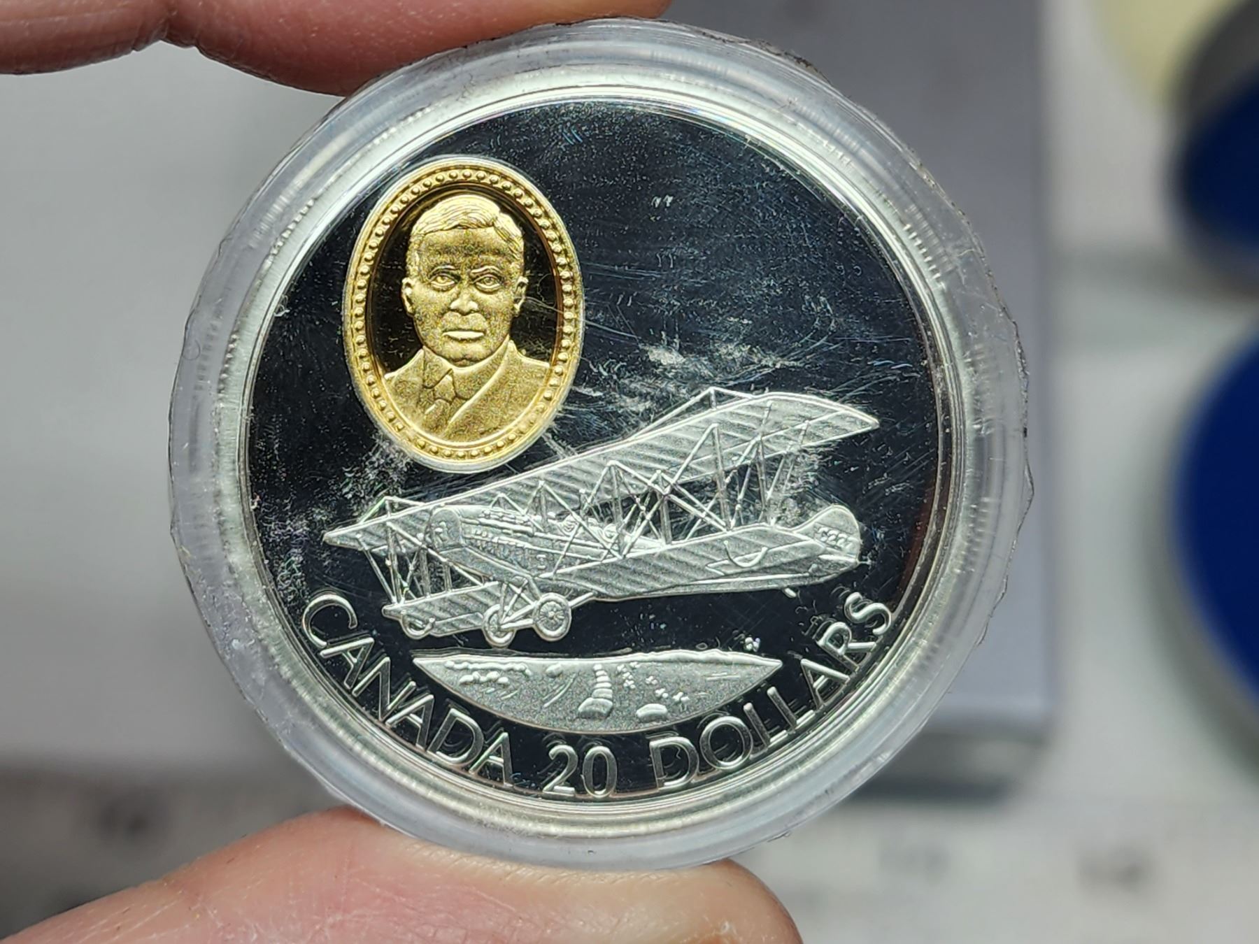 1992 $20 Curtiss JN4. Plane called the Canuck. Sterling Silver with 24-karat gold plated Cameo. Proof. Housed in its original RCM case & box of issue.