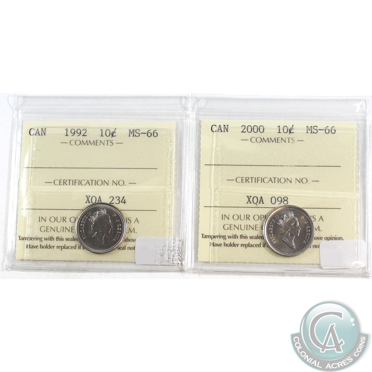1992 & 2000 Canada 10-cent ICCS Certified MS-66. 2pcs.