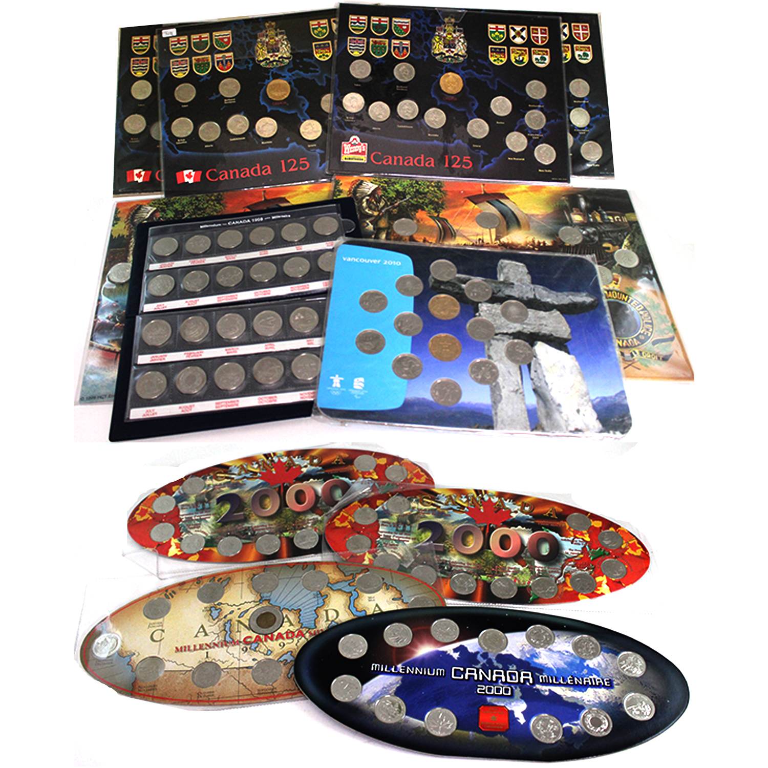 INCLUDES: 1992 Canada 125th Anniversary 25-cents with the Parliament Loon Dollar, 1999 Quarter Board with Nunavut $2, 2000 Millennium 25-cent Oval Board & Many More!! Sold as is; please see images for details. 12pcs.