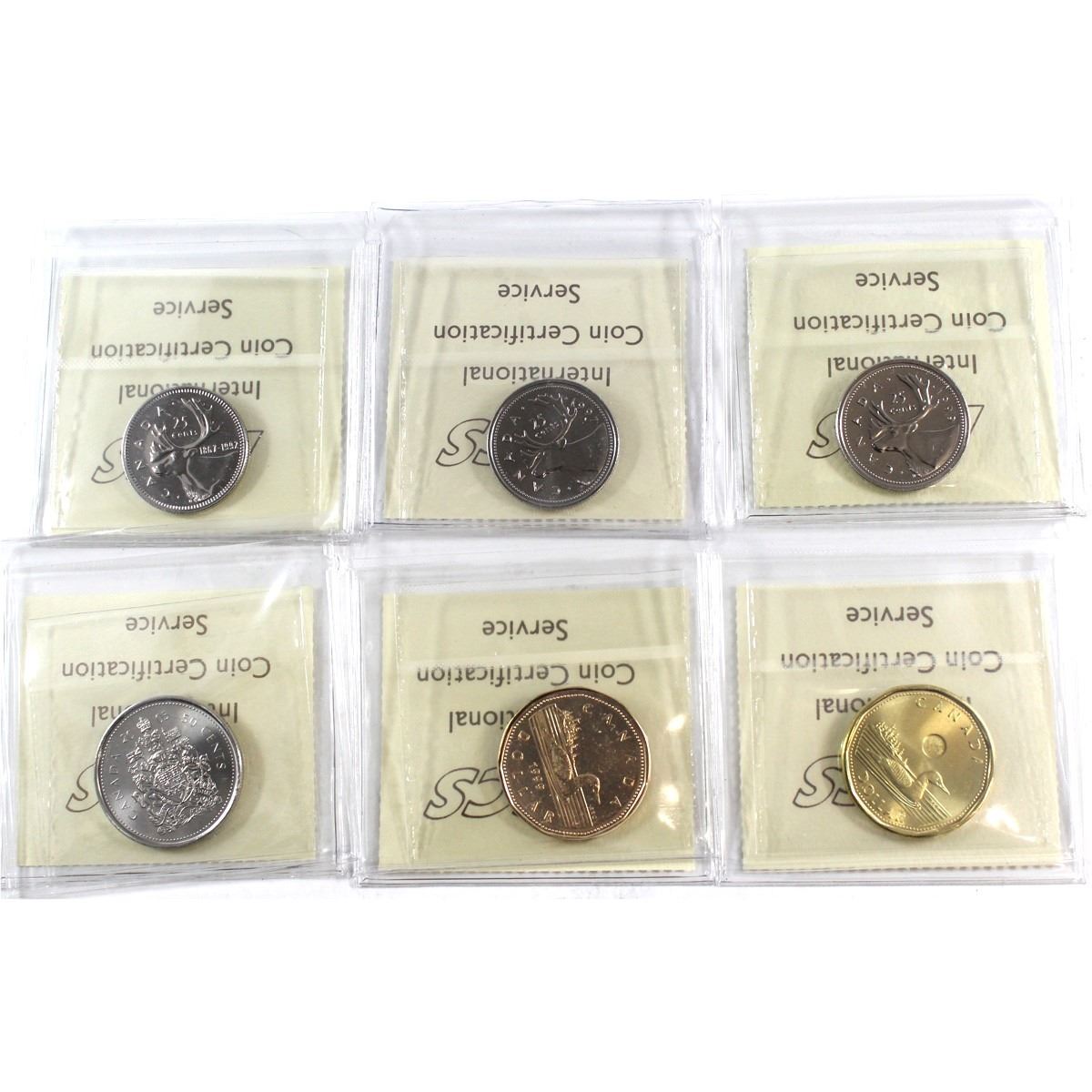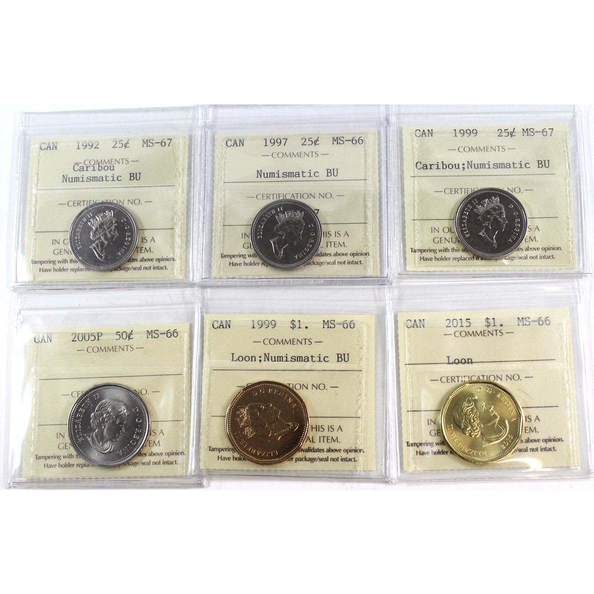 1992-2015 Canada 25-cent, 50-cent & Loon $1 ICCS Certified - 1992 25-cent MS-67 NBU, 1997 25-cent MS-66 NBU, 1999 25-cent MS-67 NBU, 2005P 50-cent MS-66, 1999 Loon $1 MS-66 NBU & 2015 Loon $1 MS-66. 6pcs