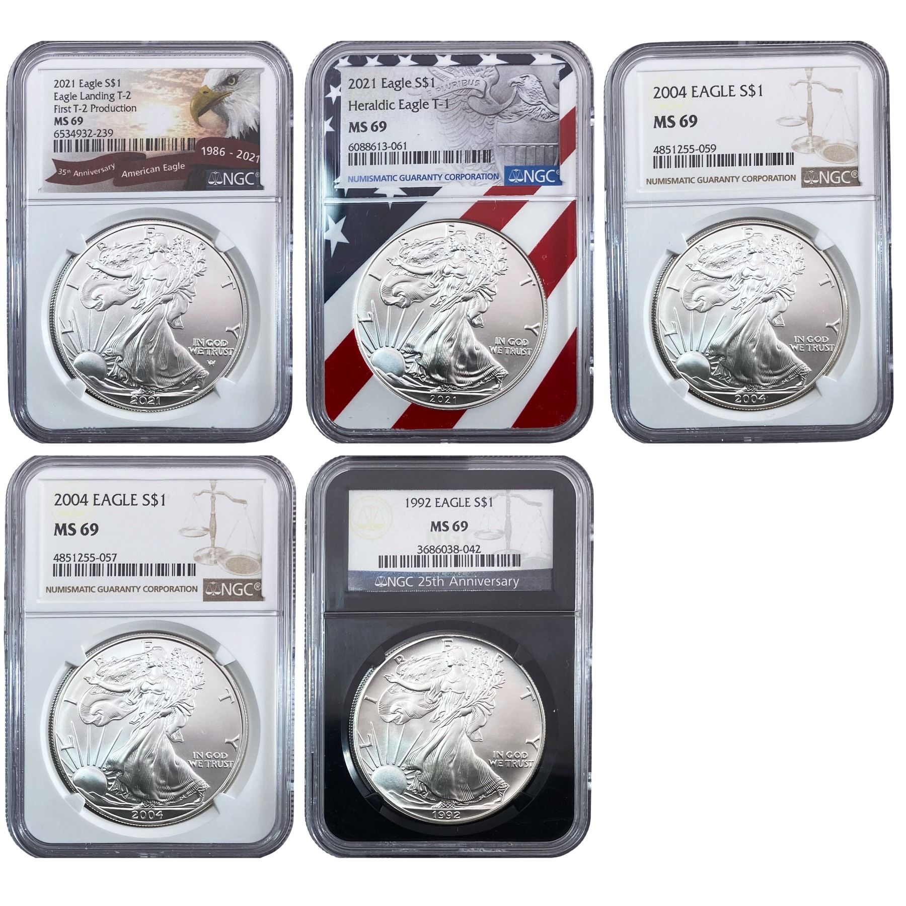 1992-2021 GEM BU Silver Eagle [5 Coins] NGC MS69
