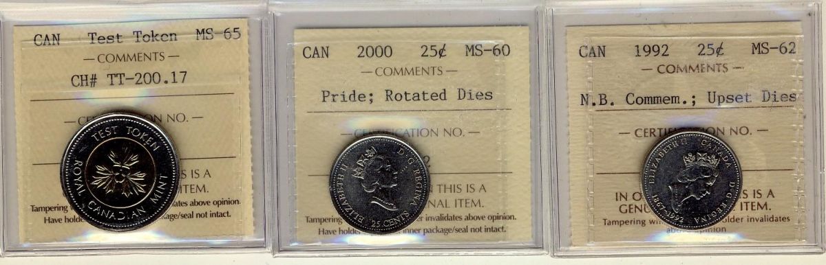 1992 25¢ N.B. Upset Dies MS62, 2000 25¢ Pride Rotated dies MS60 & $2 Test Token CH#TT-200,17 MS65. Lot of 3 ICCS graded varieties.