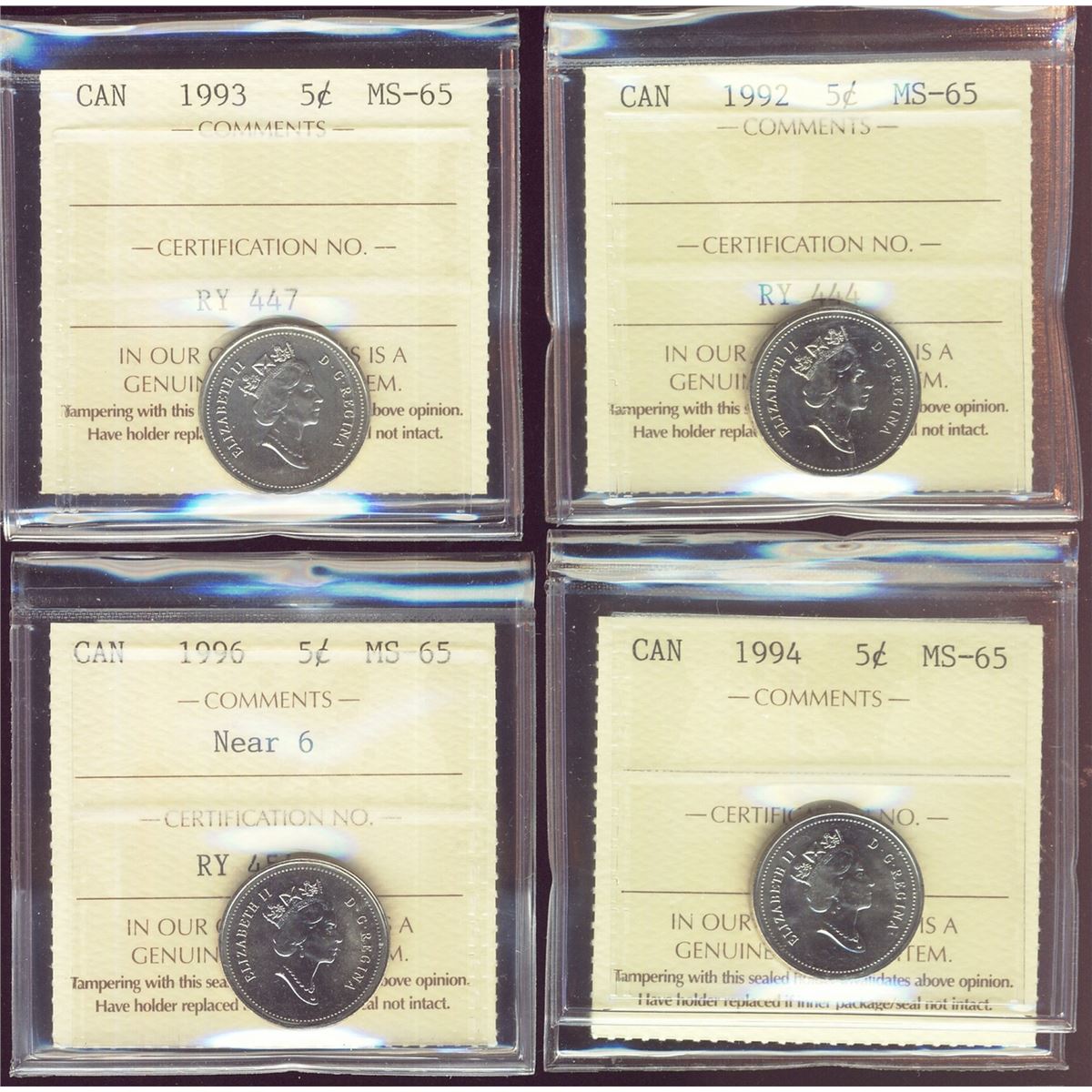 1992 5¢, 1993, 1994 & 1996 Nr ICCS MS65. Lot of 4 coins.