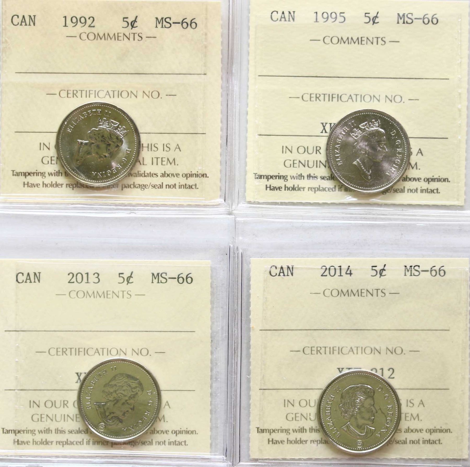 1992 5¢, 1995, 2013, 2014 All 4 coins ICCS Superb Gem Mint State-66.