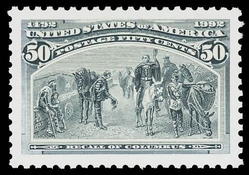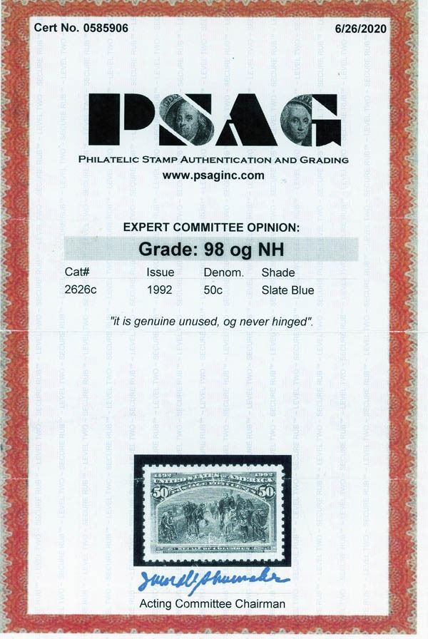 1992, 50¢ Voyages of Columbus, single from souvenir sheet. Scott 2626c. SMQ $100, Sup, with 2024 P.S.A.G. certificate graded SUP 98 plus a missing PSE cert #114109 also graded SUP 98
