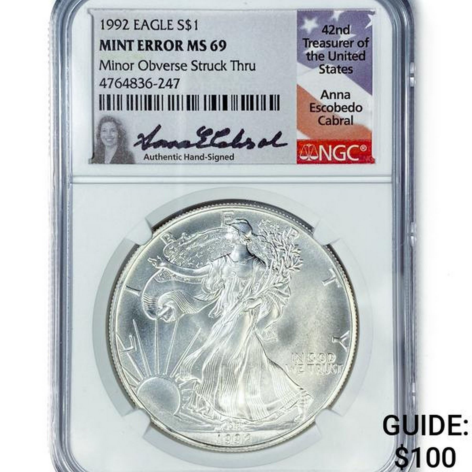 1992 ASE Escobedo Signed NGC MS69 Obv Struck Thru