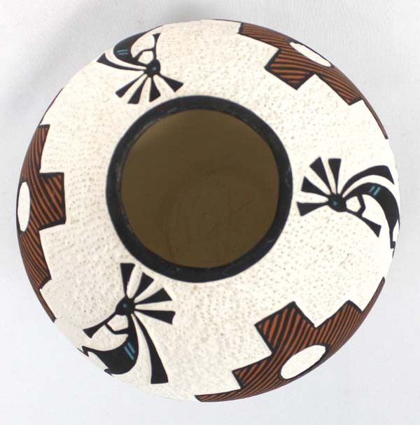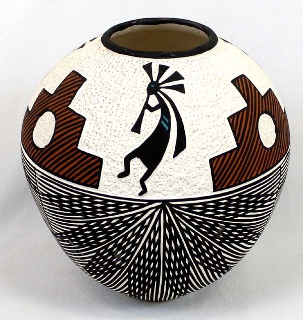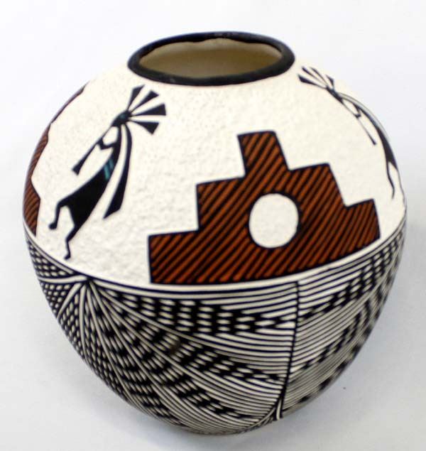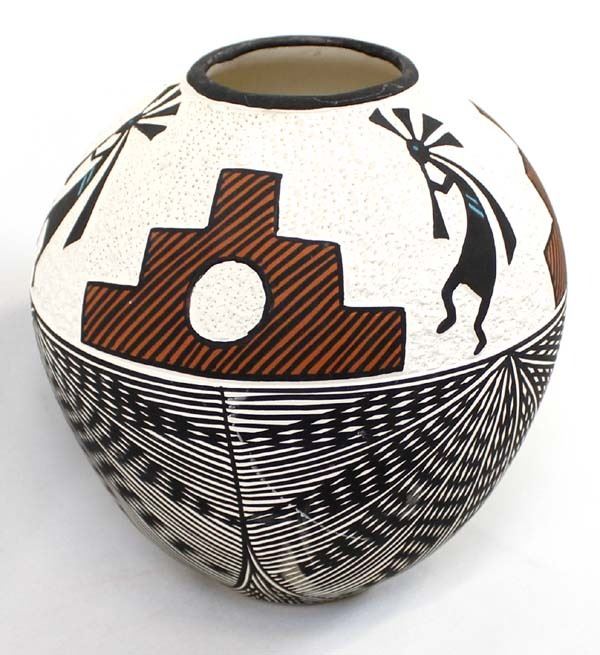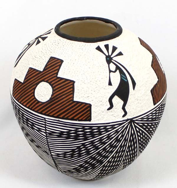 1992 Native American Acoma Etched Pottery Bowl by Gary ''Yellowcorn'' and Corrine Louis, measures 7'' x 8'' and is signed on the bottom, features eye dazzling designs, kokopelli, and stairstep pueblo designs