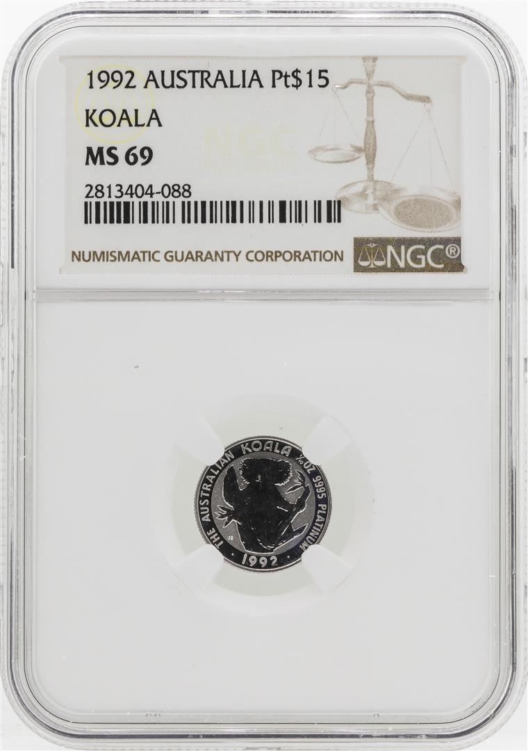 One 1992 Australia $15 Platinum Koala Coin NGC MS69. NGC Certified.