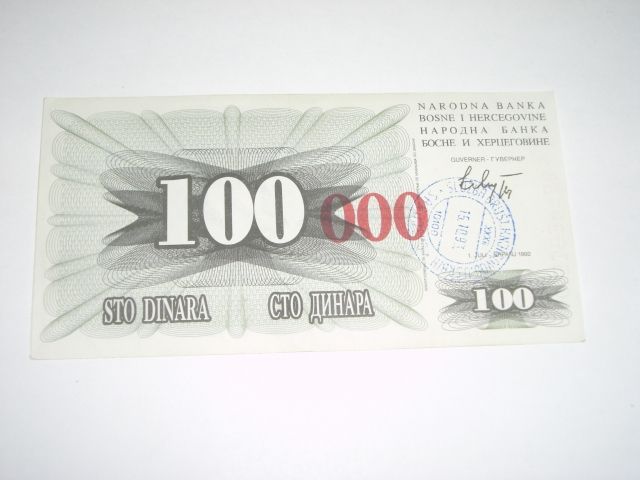 1992 BOSNIA 100 000 DINARA NOTE *EXTREMELY RARE UNC HIGH GRADE NOTE*!! ***Coin, Currency & All Items Listed in this auction - Grades, Conditions and Values are not Safe Deposit Coins LLC Responsibilty. Grades, Condition and Values are determined by Consigner(s) & Buyers ONLY***