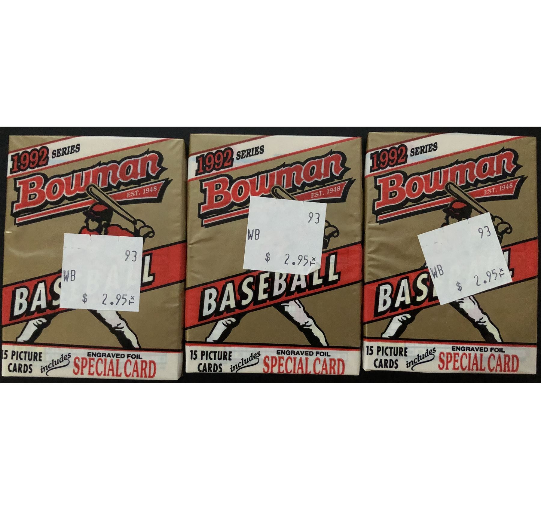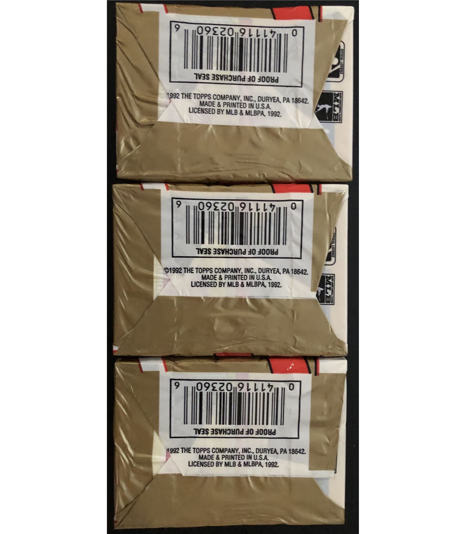 Three sealed cello packs, each containing 15 cards & special engraved foil card MLB, baseball, TOPPS