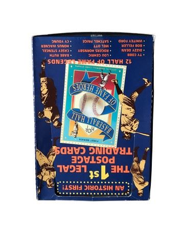 1992 Baseball Card Stamps 1st Series Hall Of Fame Legends Box. Opened box but all packages inside are sealed. Includes stamp cards for 12 Hall of Fame legends including Ty Cobb, dizzy Dean, Bob Feller, Whitney Ford, Lou Gehrig, Rogers Hornsby, Mel Ott, satchel Paige, Babe Ruth, Casey Stengel, Honus Wagner and Cy Young.Also included is a letter of authenticity from Alan Shawn Feinstein associates stating a description of the baseball card/stamp set. It states that this is the very first trading card set ever made to be legal postage tender. That means that each of these cards can be used for postage and it’s country of origin – St. Vincent and the Grenadines – for its full face value. also states that it’s equivalent to about $1.50 in the United States at the current exchange rate back in the 90s when this was first issued.