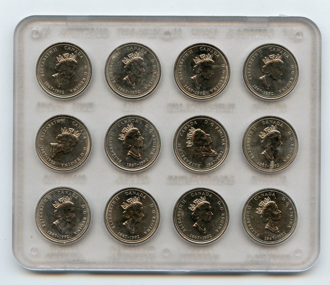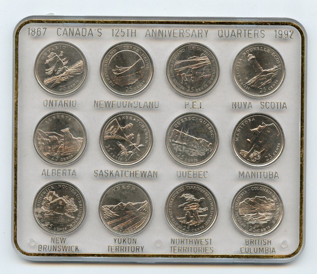 Canada's 125th Anniversary Quarters. 12 commemorative 25-cent coins in special holder.