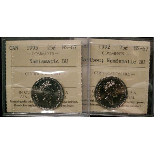 1992 Caribou, 1995 25¢, both ICCS MS-67 "Numismatic B.U."