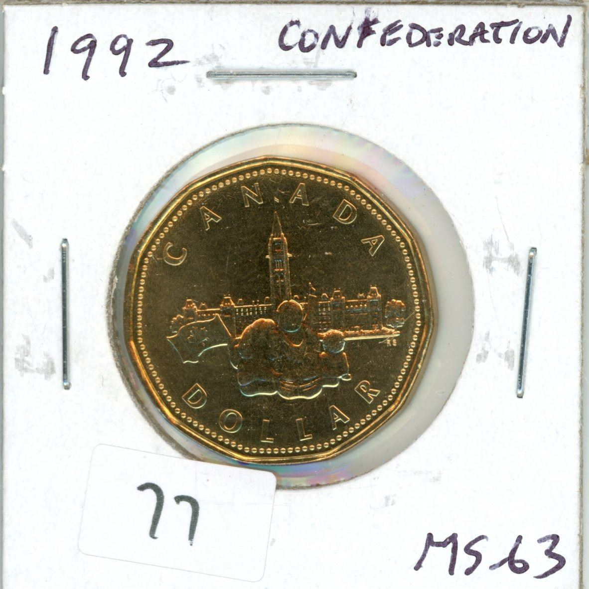 1992 Confederation Loonie Dollar. Commemorates the 125th Anniversary of Confederation. MS-63 from an original roll.
