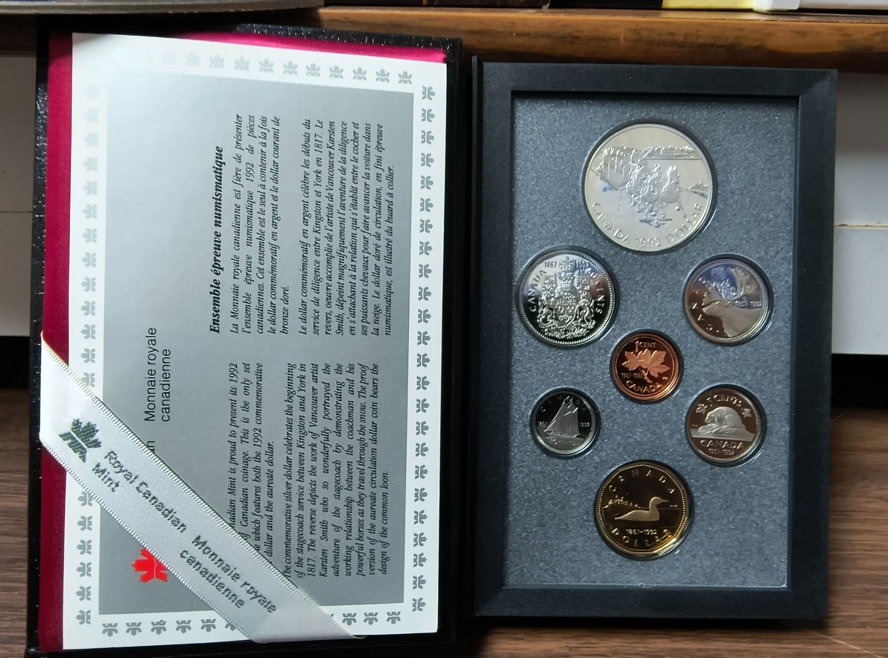 1992 Double Dollar Proof Set. The Silver Dollar commemorates the 175th Anniversary of the first stagecoach service between Kingston and York (now Toronto). Proof with Ultra Heavy Cameos. Bright White. Housed in its original Royal Canadian Mint case of issue. Includes Certificate of Authenticity.