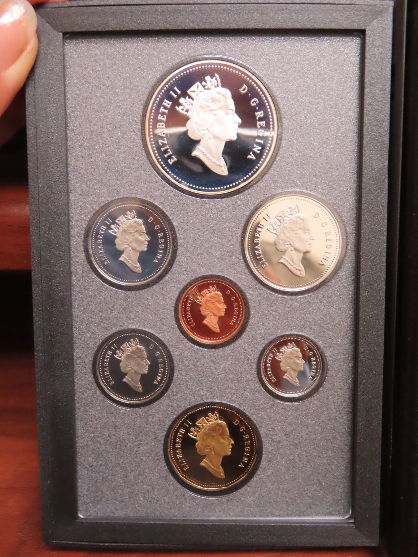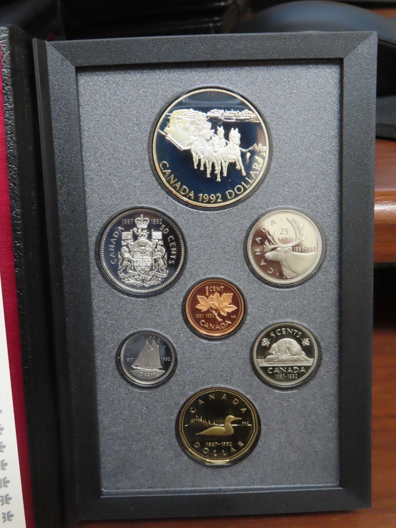 1992 Double Dollar Proof Set. The Silver Dollar commemorates the first stagecoach service between Kingston & York (now Toronto). Silver Dollar is Sterling Silver. Proof with Ultra Heavy Cameos. 7-coin set. Housed in its original Royal Canadian Mint case of issue.