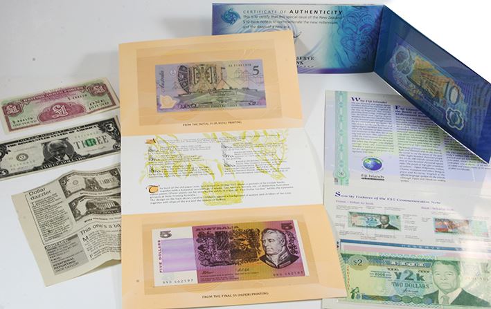 1992 Fraser/ Cole First & Last Folder, together with 2000 Millennium New Zealand Ten Dollars, 2000 Millennium Fiji Two Dollar, plus One Pound British Armed Forces 4th series note - EF & USA Funny Money, 'In 3 Dollars, in Bill we trust not' with news paper clipping