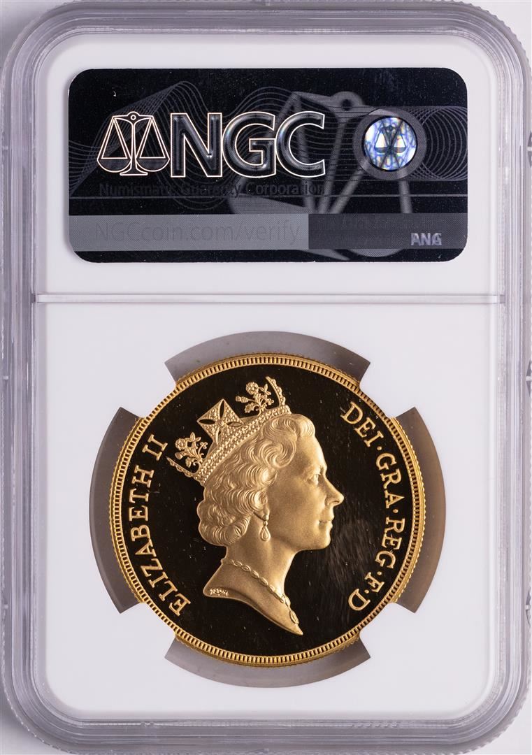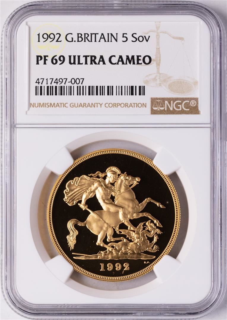 One 1992 Great Britain 5 Sovereigns Proof Gold Coin NGC PF69 Ultra Cameo. NGC Certified.