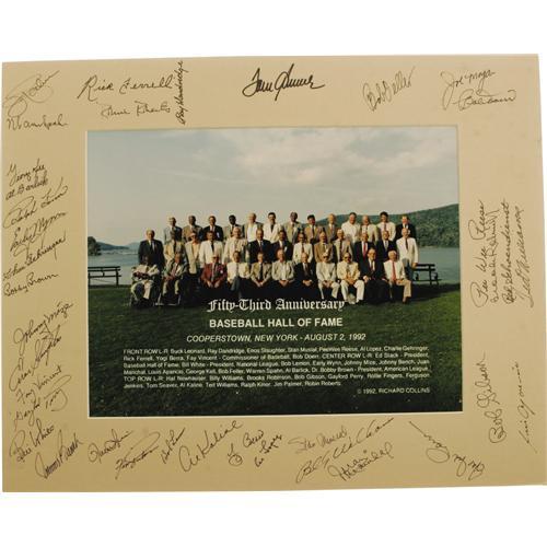 <B>1992 Hall of Fame Induction Ceremonies Multi-Signed Photograph.</B></I> Official group portrait snapped at the fifty-third anniversary of the opening of the Baseball Hall of Fame in Cooperstown derives from the personal collection of the Hall's top corporate sponsor. These beautiful oversized displays were made available only to players and a very few VIP's, and were never offered to the general public. The mat surrounding the photo bears the 10/10 black sharpie signatures of thirty-seven Hall of Famers pictured, including Ted Williams, Spahn, Dandridge, Seaver, Reese, Gibson, Aparicio, Musial, Kaline, Bench, Mize, Gehringer, Wynn, Kiner, Kell and many more. Total dimensions 16x20". <I>LOA from PSA/DNA. LOA from James Spence Authentication.</B></I><BR><BR><b>Shipping:</b> Flat Material, Large (<a target="_blank" href="http://www.heritageauctions.com/common/shipping.php">view shipping information</a>)