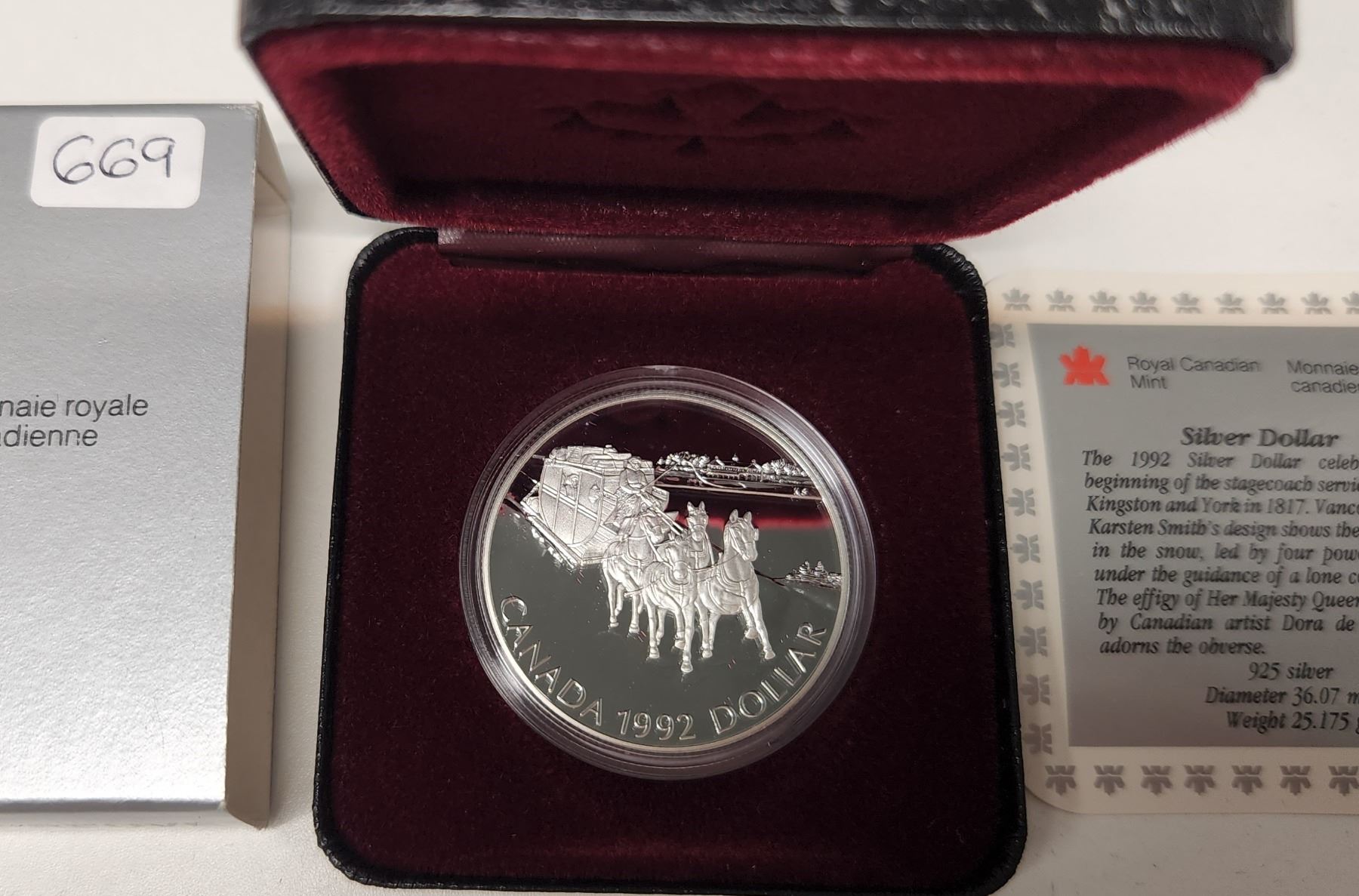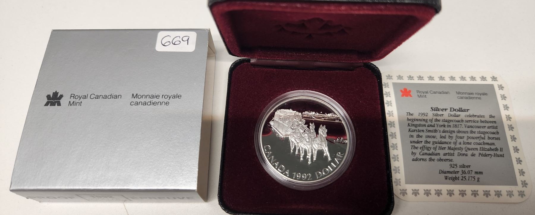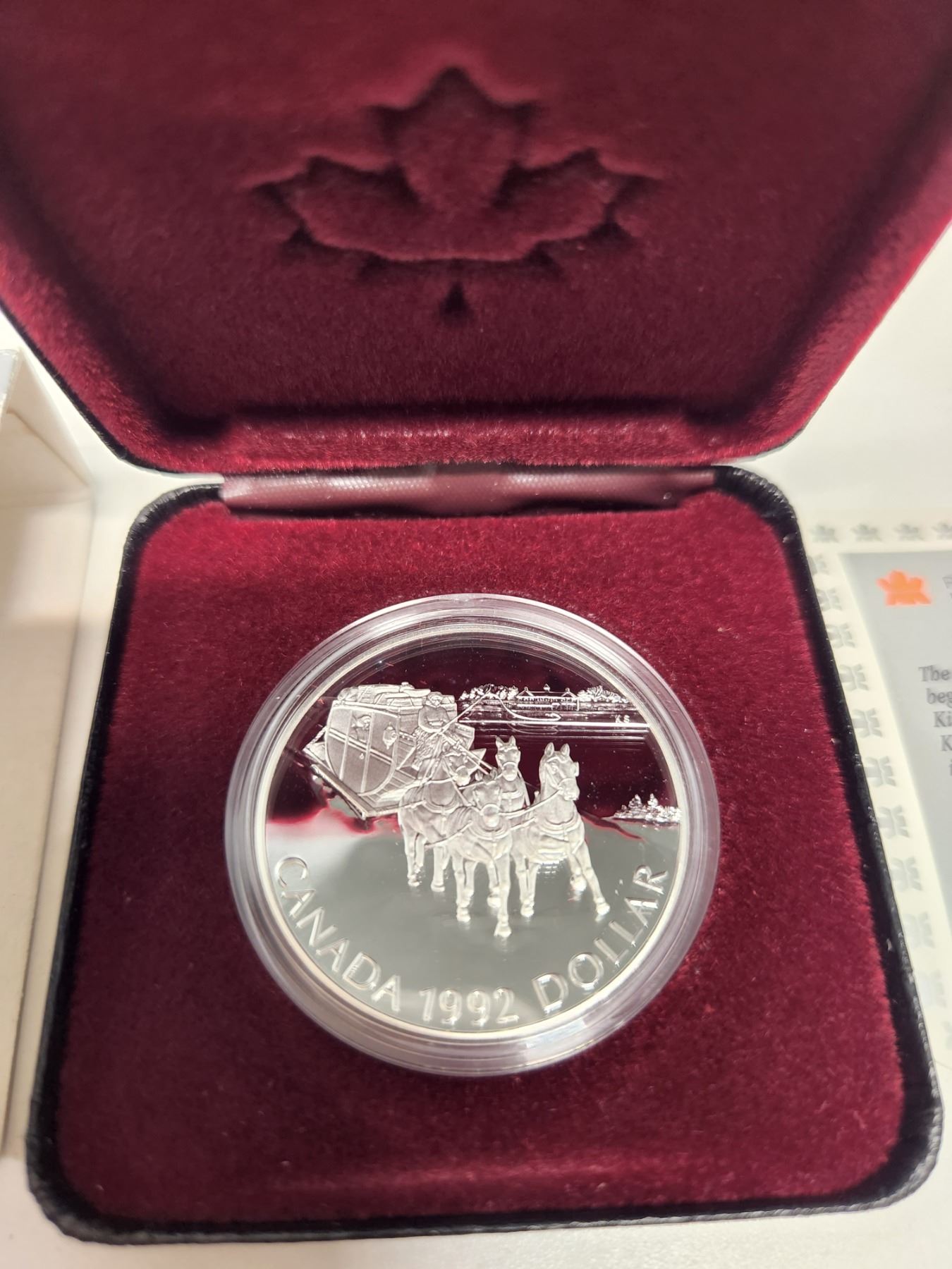 1992 Kingston Stagecoach Proof Silver Dollar. Commemorates the 175th Anniversary of the first stagecoach service between Kingston and York. Sterling Silver. Bright White with Ultra Heavy Cameo. In case and box of issue.