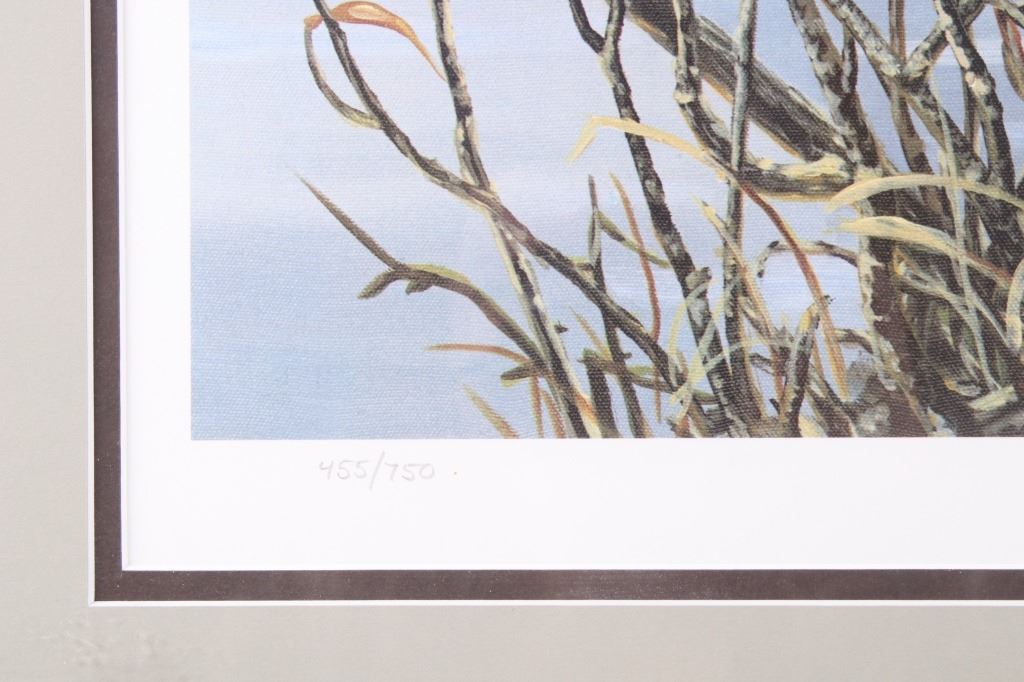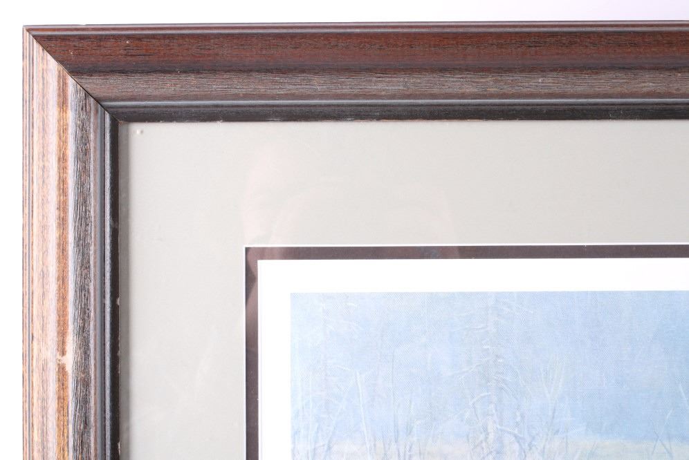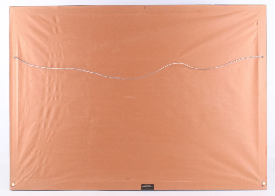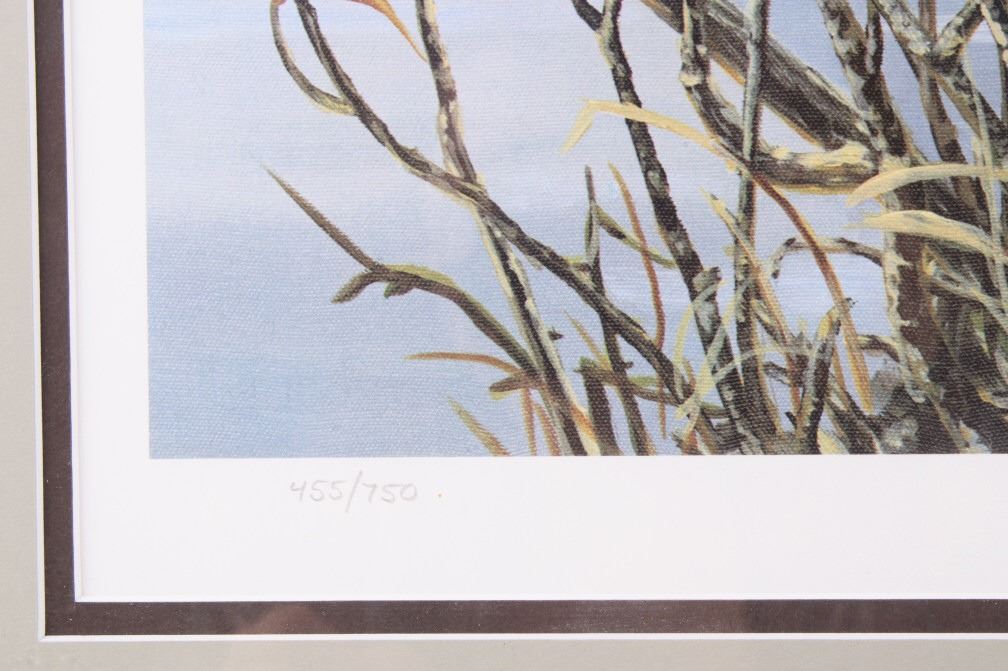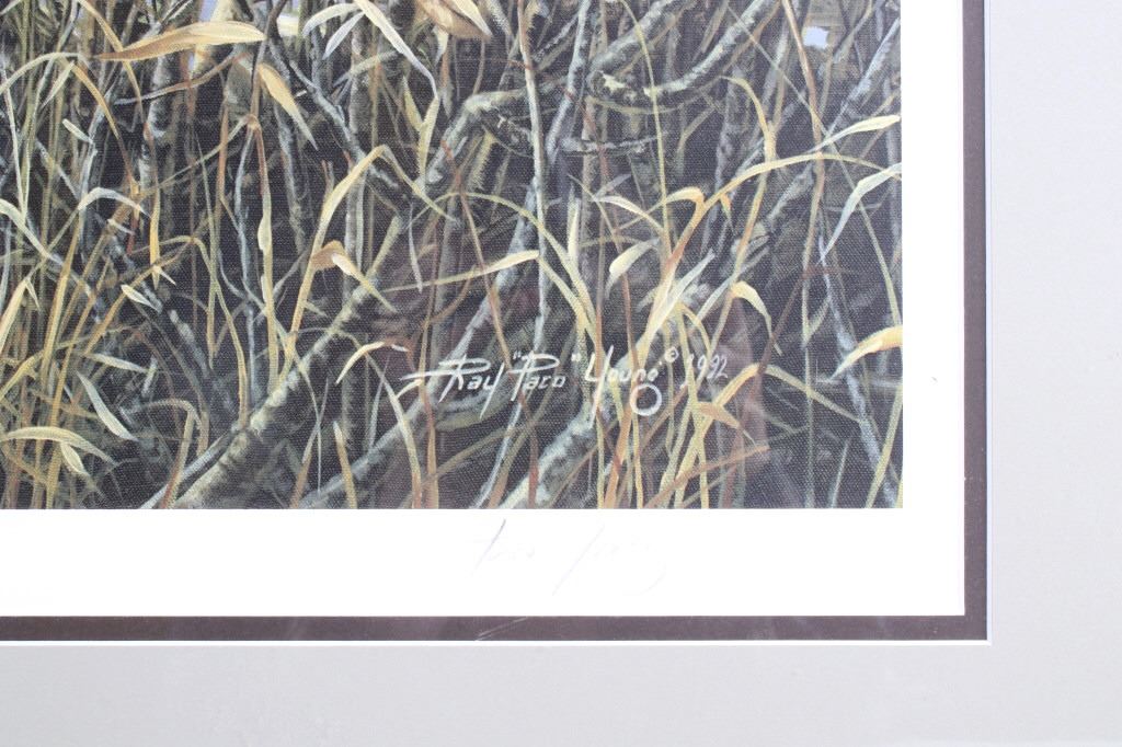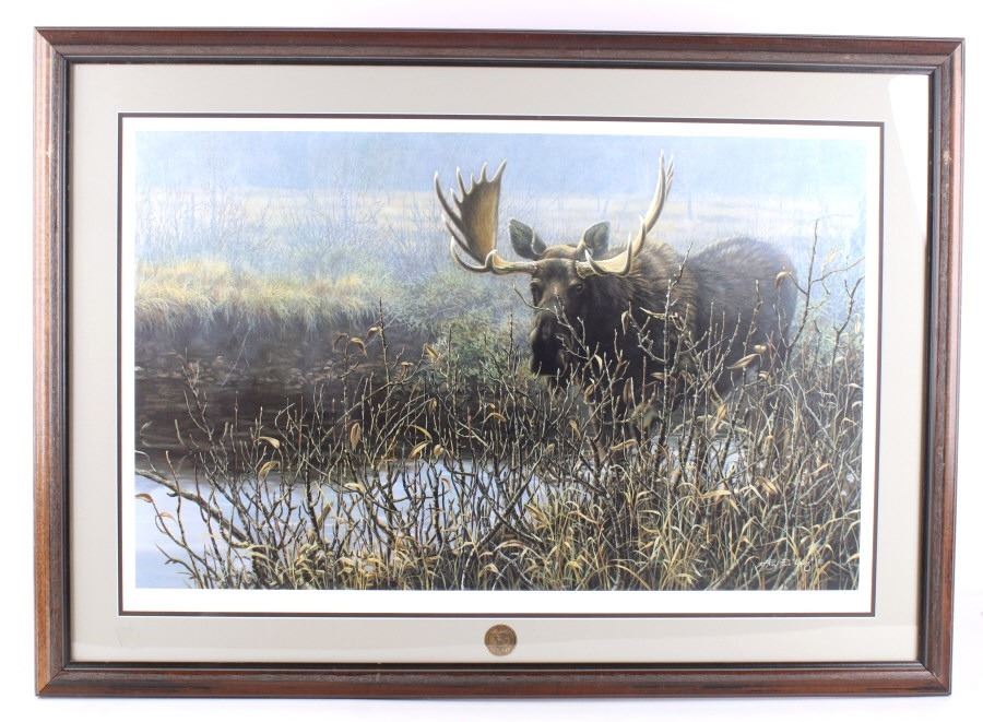 For your consideration is this 1992 NRA lithograph of a moose poised in a creek bed by Ray "Paco" Young. This lithograph shows a beautiful scene of a clearing with a moose in the creek. For ten years, Young’s studio was in Atlanta, Georgia, where he did traditional wildlife paintings; however, in 1994, he and his family moved to land on the Gallatin River near Bozeman, Montana, where he avidly pursues fly fishing. His painting is directed to the landscape, especially winter scenes. Young has discovered his passion for plein air landscape painting while living in Montana. The lithograph shows the artist’s signature in the bottom right-hand corner, as well as the date with the number of the lithograph in the right-hand corner (455/750) and the National Rifle Association Crest centered in the median of the lithograph. The overall condition of this framed lithograph is good, with no obvious signs of damage and some wear to the frame. The measurements of this framed lithograph are 30" x 41 1/2" and the visible art measures 21 3/4" x 33 1/2".