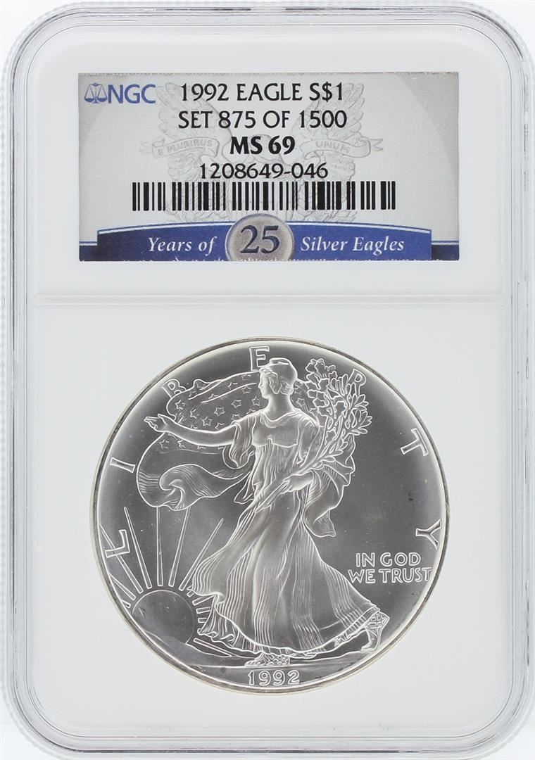One 1992 NGC MS69 25th Anniversary American Silver Eagle Dollar. NGC Certified.