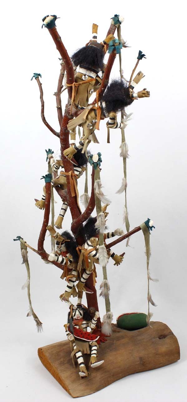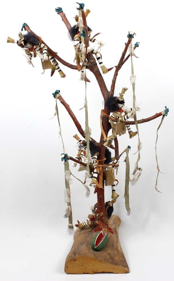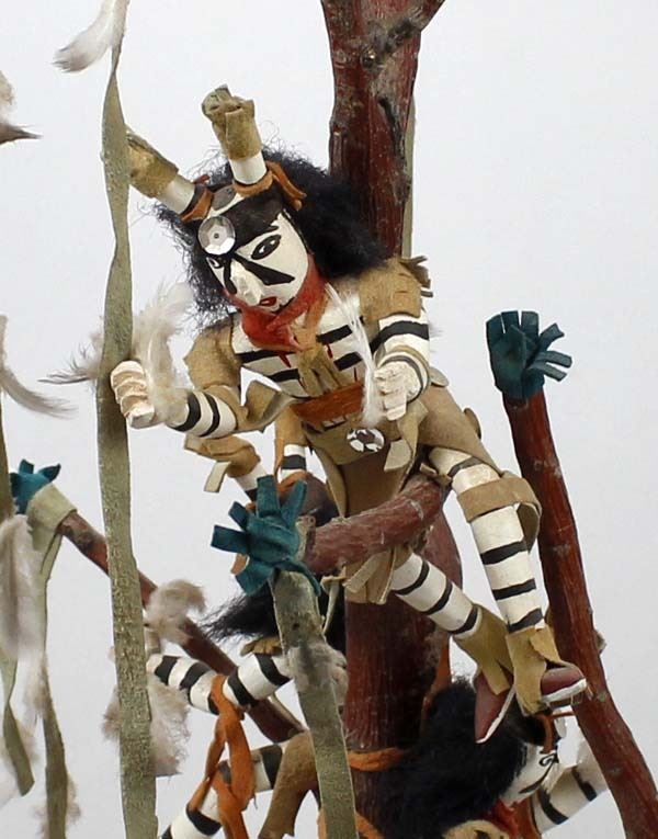 1992 Native American Navajo Koshare Clown Kachina Tree by R. Benally, measures 9'' x 11'' x 24'' and is signed on the bottom and called ''Hano Clowns'', embellished with leather, feathers, sequins, faux leather, faux fur, and shells, great whimsical piece