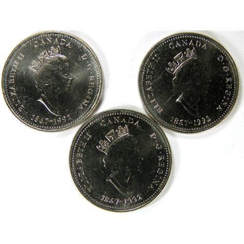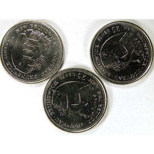 Canada Twenty-Five Cents 1992 New Brunswick Die Rotation Group: 110o, 150o and 180o. Three pieces with varying die misalignments, all Uncirculated to Choice Uncirculated