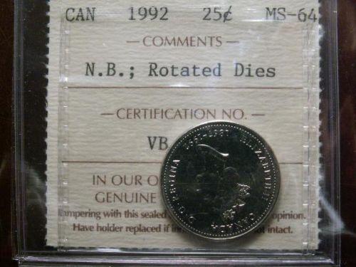 1992 New Brunswick "Rotated dies " 25¢ ICCS MS64. Brilliant with reflective surfaces. A popular error coin!