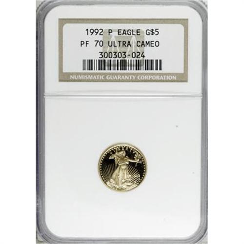 <B>1992-P G$5 Tenth-Ounce Gold Eagle PR70 Deep Cameo NGC.</B></I> NGC Census: (366/0). PCGS Population (22/0). Mintage: 64,877. Numismedia Wsl. Price for NGC/PCGS coin in PR70: $400. (#9859)<BR><BR><b>Shipping:</b> Coins & Currency (<a target="_blank" href="http://www.heritageauctions.com/common/shipping.php">view shipping information</a>)