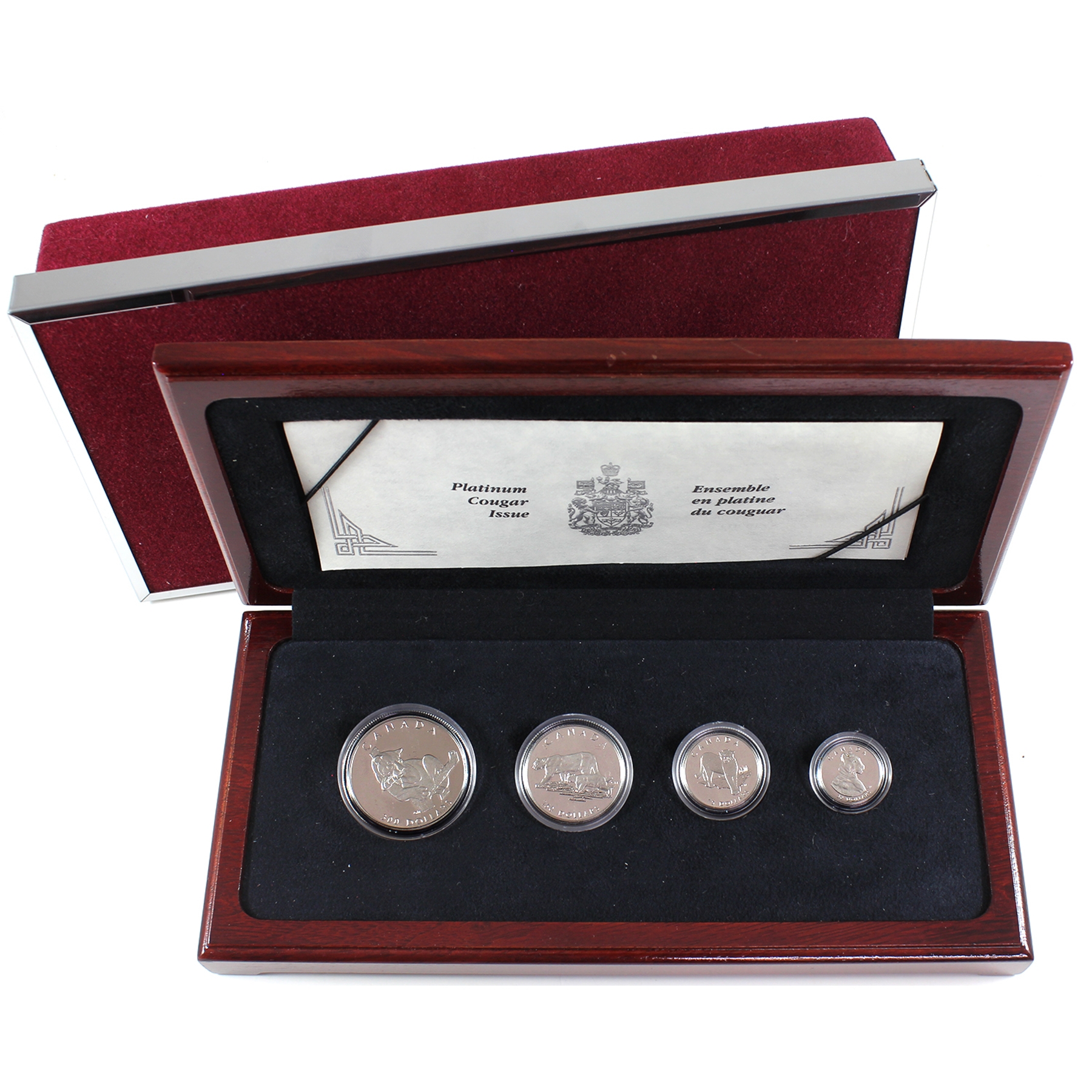 INCLUDES: 1oz $300, 1/2oz $150, 1/4oz $75, & 1/10oz $30 coins. Each coin is .9995 fine, and has a different design depicting cougars. Capsules are lightly scuffed (Tax Exempt)