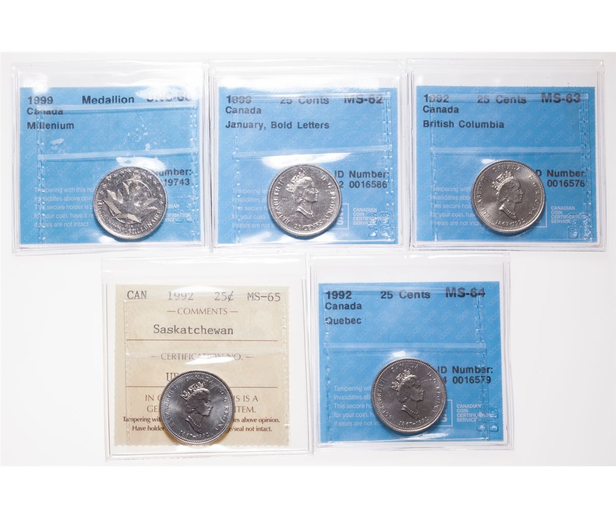 1992. Quebec. CCCS Mint State-64; 1992. Saskatchewan. ICCS Mint State-65; 1992. British Columbia. CCCS Mint State-63; 1999. January. Bold letters. CCCS Mint State-62; 1999. Medallion. CCCS Unc-60. Lot of five (5) pieces.