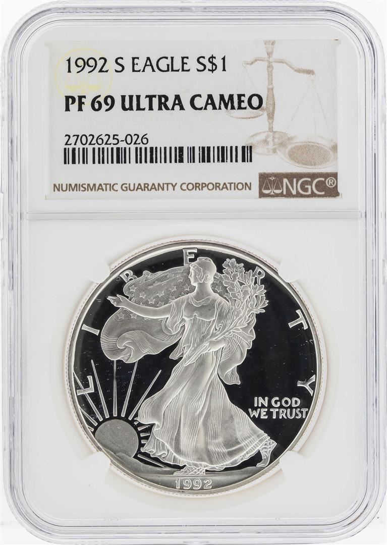 One 1992-S $1 American Silver Eagle Coin NGC PF69 Ultra Cameo. NGC Certified.