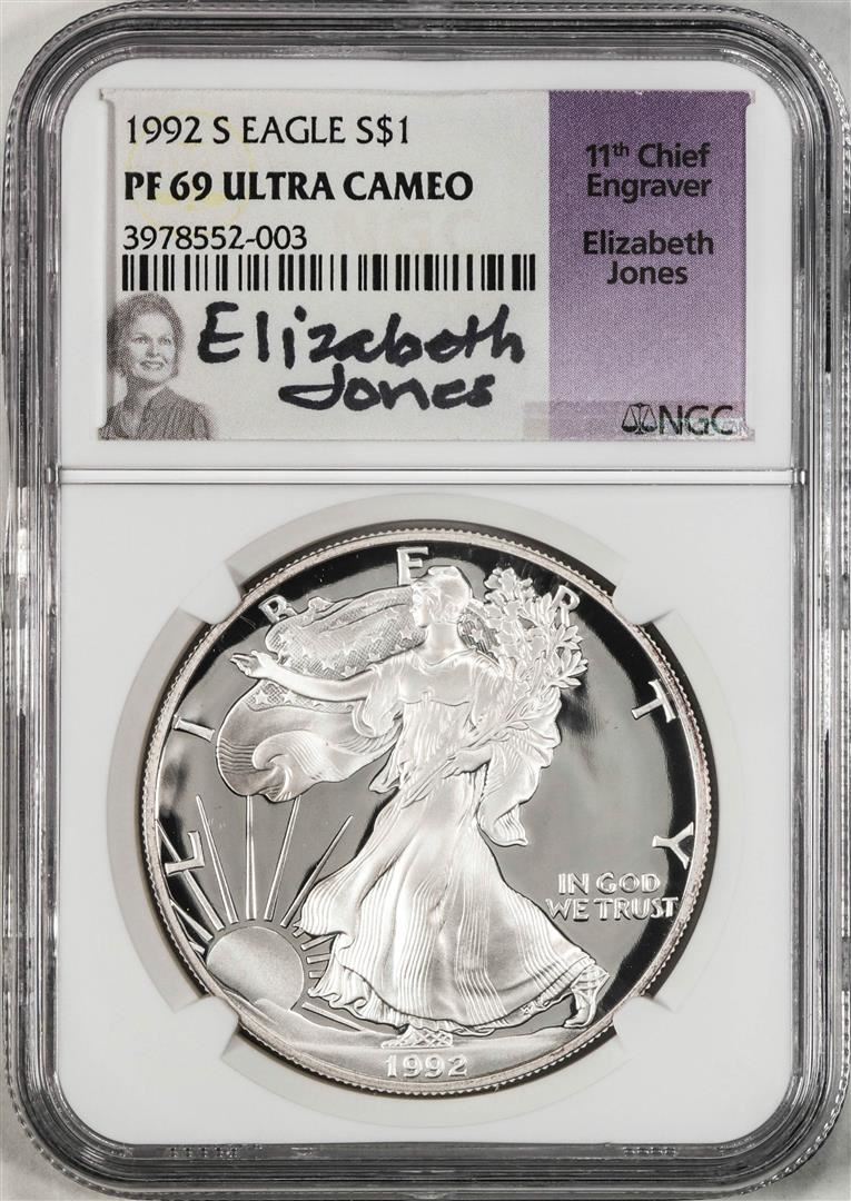 One 1992-S $1 Proof American Silver Eagle Coin NGC PF69 Ultra Cameo Elizabeth Jones Signature. NGC Certified.