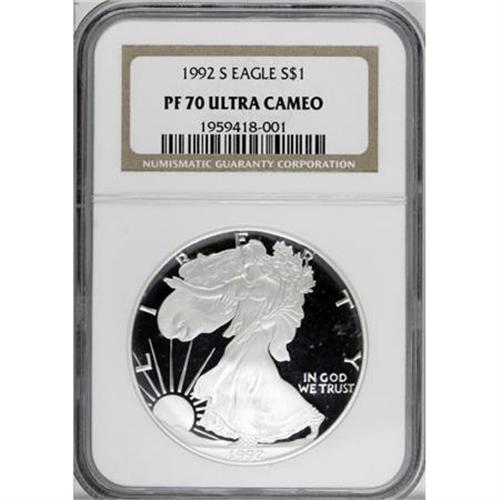 <B>1992-S $1 Silver Eagle PR70 Deep Cameo NGC.</B></I> NGC Census: (543/0). PCGS Population (41/0). Mintage: 498,654. Numismedia Wsl. Price for NGC/PCGS coin in PR70: $380. (#9857)<BR><BR><b>Shipping:</b> Coins & Currency (<a target="_blank" href="http://www.heritageauctions.com/common/shipping.php">view shipping information</a>)