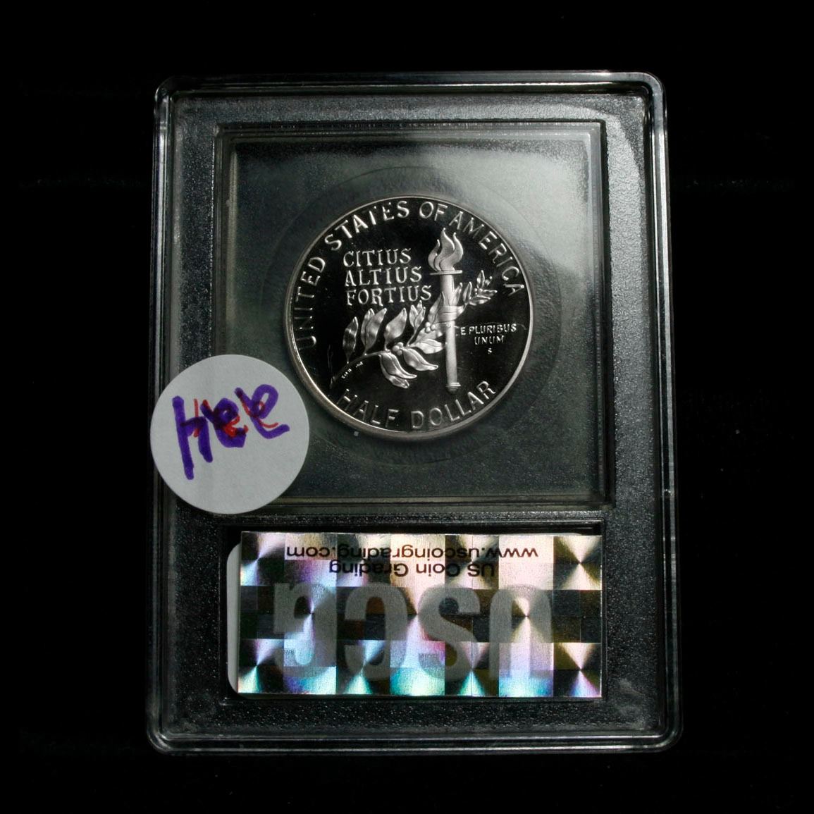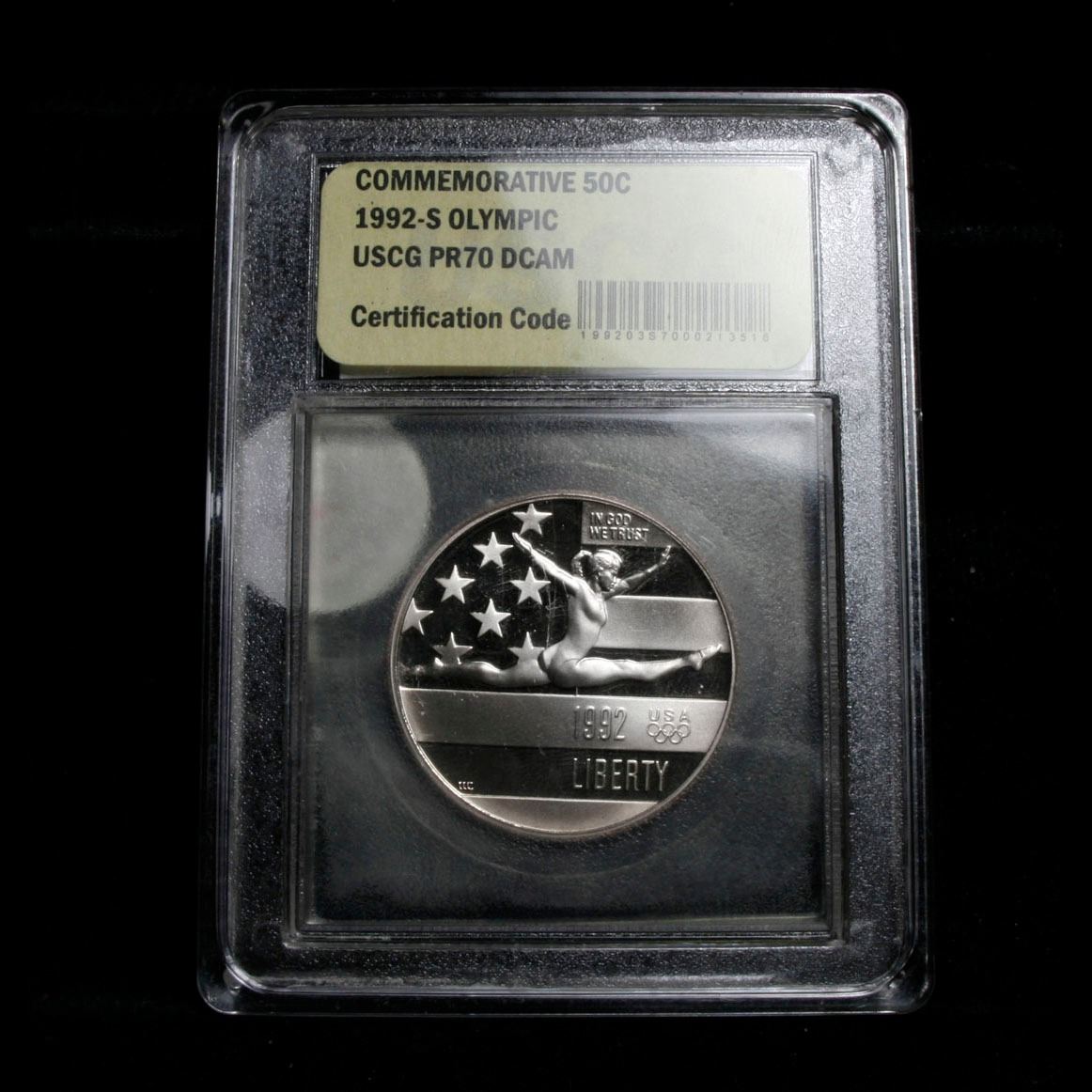 1992-S Olympic . . Modern Commem Half Dollar 50c Graded GEM++ Proof Deep Cameo by USCG.        The 1992 Olympic Proof Half Dollar was issued for the XXV Olympic Games.  This commemorative has an olympic gynmast on the obverse.  This coin is graded Perfection Gem+++ Proof DCAM by USCG.