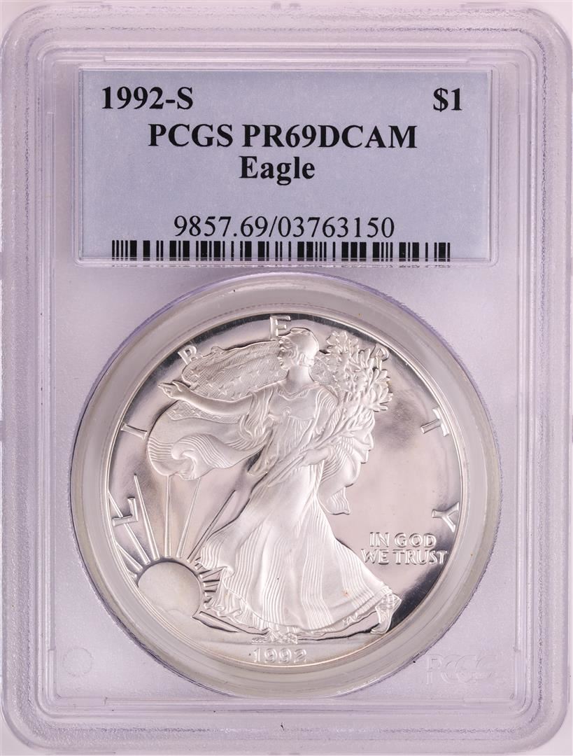One 1992-S Proof $1 American Silver Eagle Coin PCGS PR69DCAM. PCGS Graded.