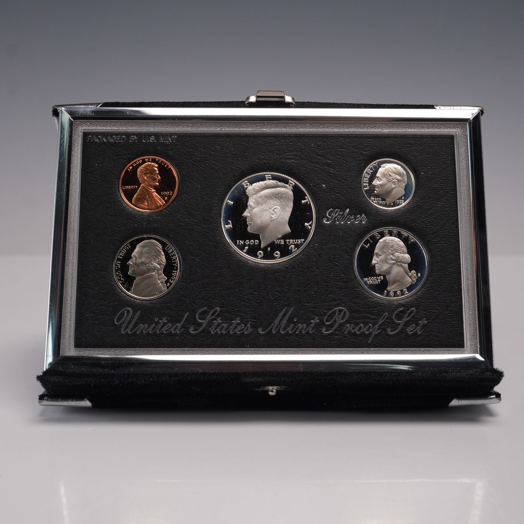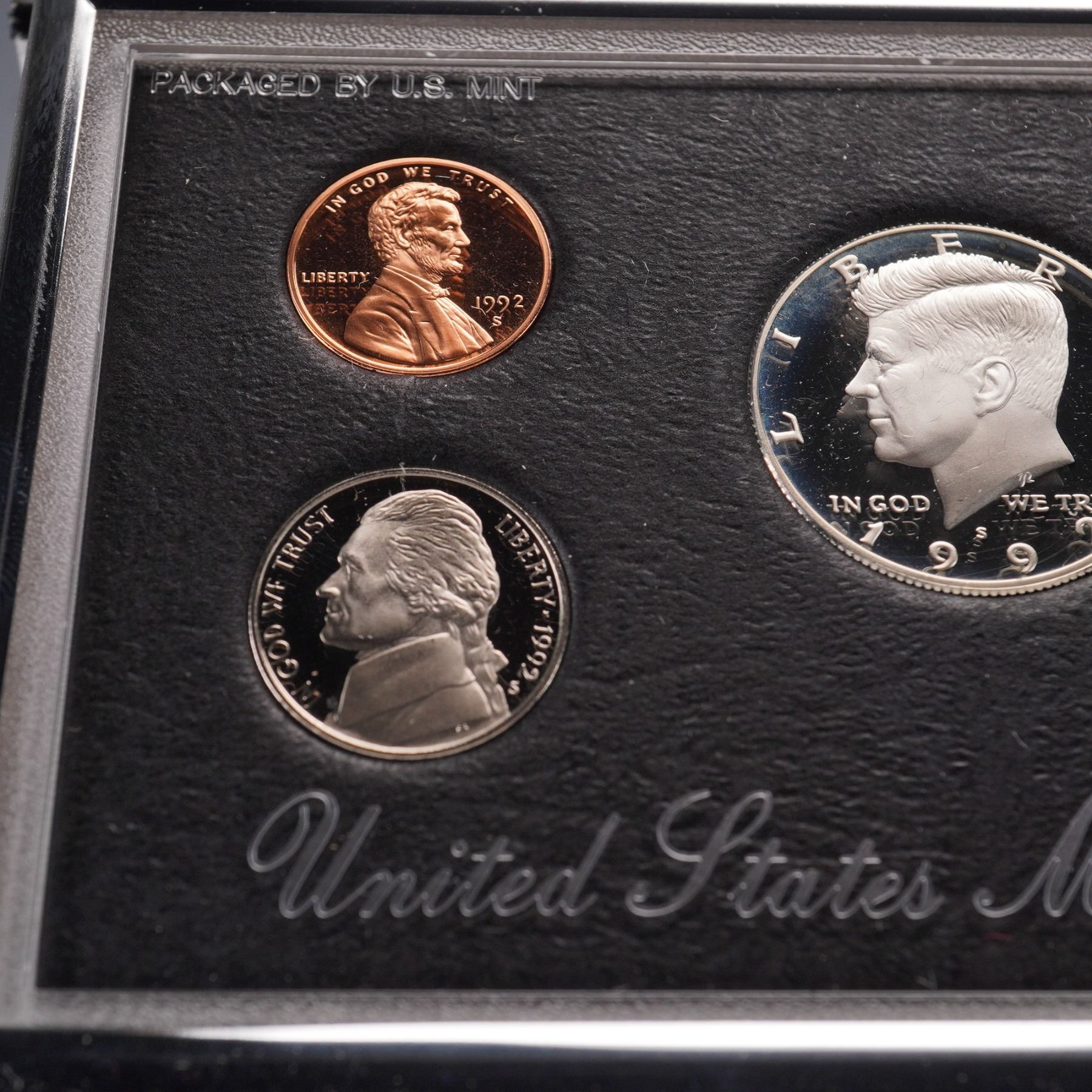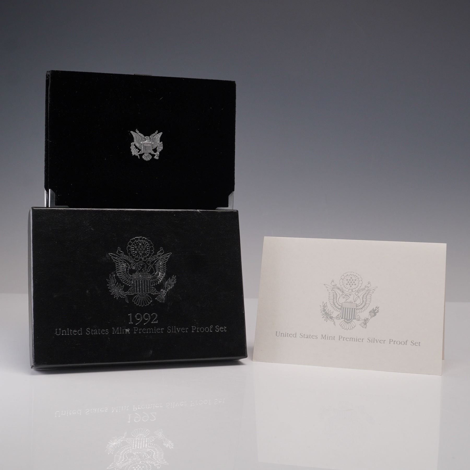 1992 Premier Silver Proof Set issued by the United States Mint, housed in its original black velvet presentation case with silver-toned trim and eagle insignia. This proof set includes five coins struck in San Francisco and marked with the "S" mintmark. The set features the following denominations: one Lincoln Cent, one Jefferson Nickel, one Roosevelt Dime, one Washington Quarter, and one Kennedy Half Dollar. Of these, the dime, quarter, and half dollar are composed of 90% silver. Each coin displays deep cameo contrast with frosted devices and mirror-like fields. The interior presentation insert is marked "United States Mint Proof Set" and "Silver" in script. Coins are sealed in a clear acrylic case for protection and visibility. The outer packaging is embossed with "Packaged by U.S. Mint." This set was part of the premium "Premier" series. Box: 6"L x 4.5"W x 1.25"H. Case: 5.75"L x 4"W x 1"H.