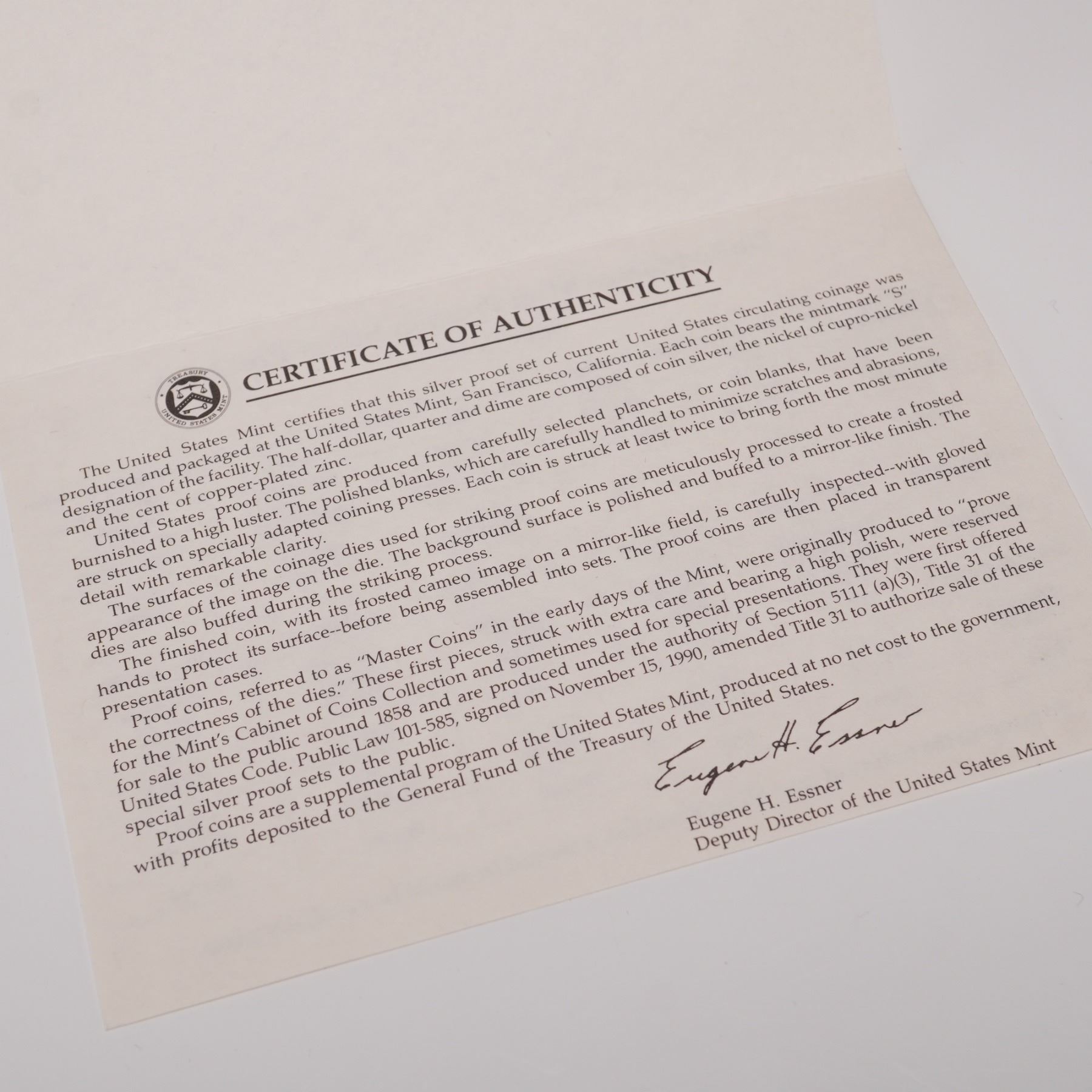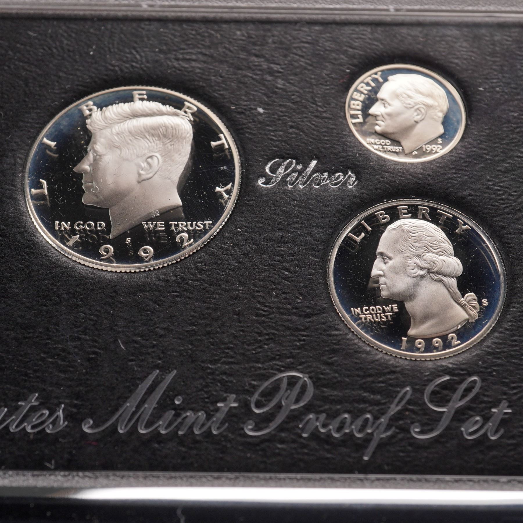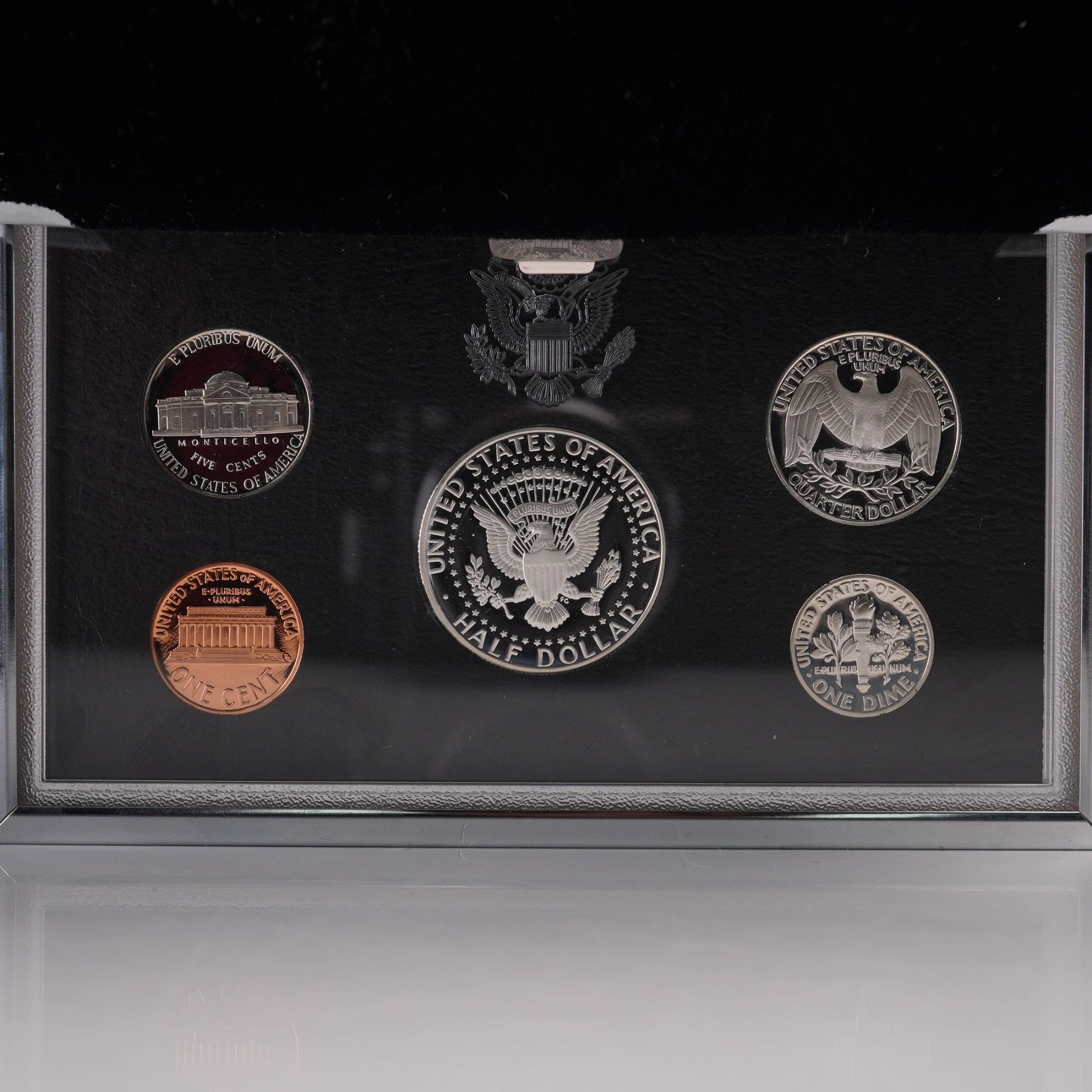 1992 Premier Silver Proof Set issued by the United States Mint, housed in its original black velvet presentation case with silver-toned trim and eagle insignia. This proof set includes five coins struck in San Francisco and marked with the "S" mintmark. The set features the following denominations: one Lincoln Cent, one Jefferson Nickel, one Roosevelt Dime, one Washington Quarter, and one Kennedy Half Dollar. Of these, the dime, quarter, and half dollar are composed of 90% silver. Each coin displays deep cameo contrast with frosted devices and mirror-like fields. The interior presentation insert is marked "United States Mint Proof Set" and "Silver" in script. Coins are sealed in a clear acrylic case for protection and visibility. The outer packaging is embossed with "Packaged by U.S. Mint." This set was part of the premium "Premier" series. Box: 6"L x 4.5"W x 1.25"H. Case: 5.75"L x 4"W x 1"H.