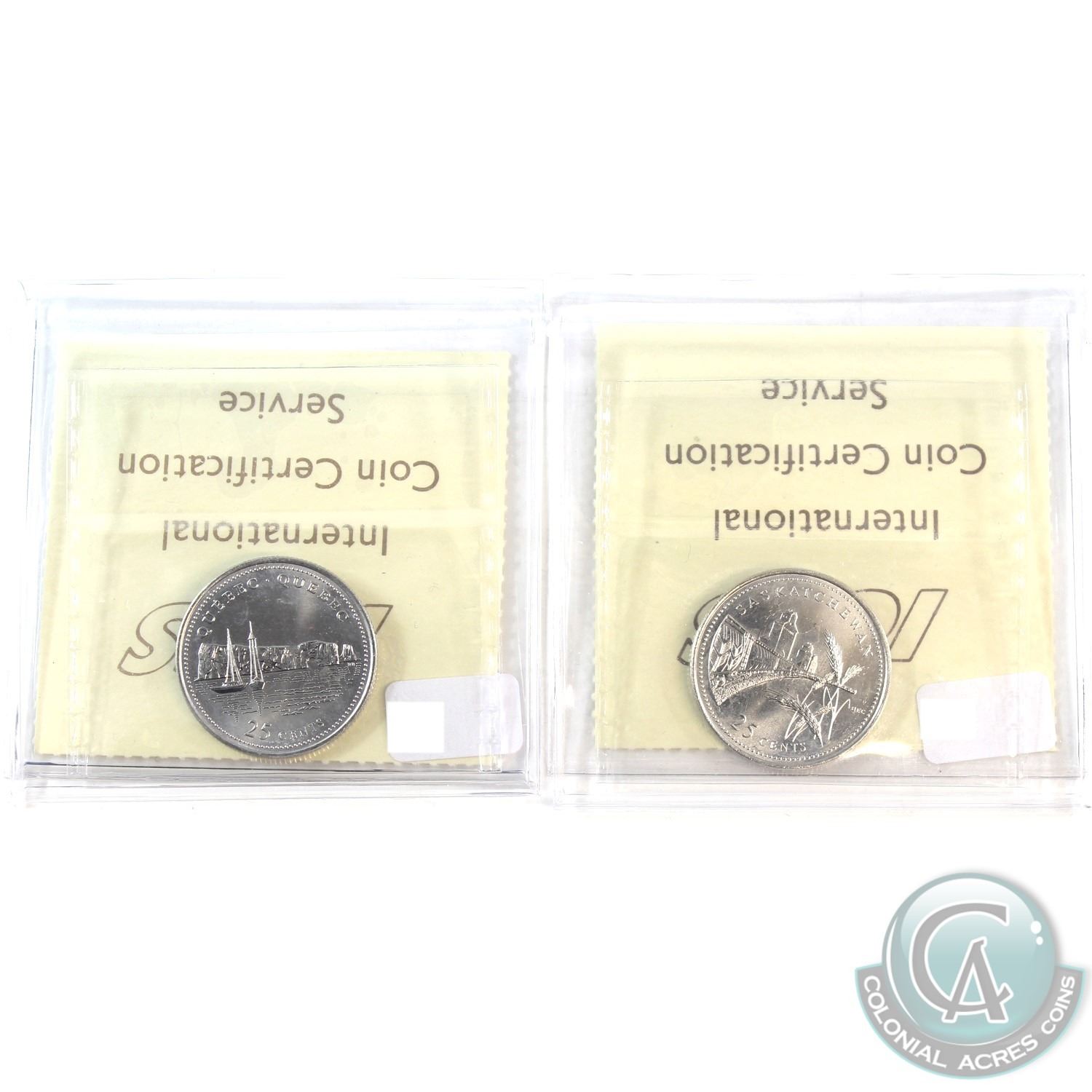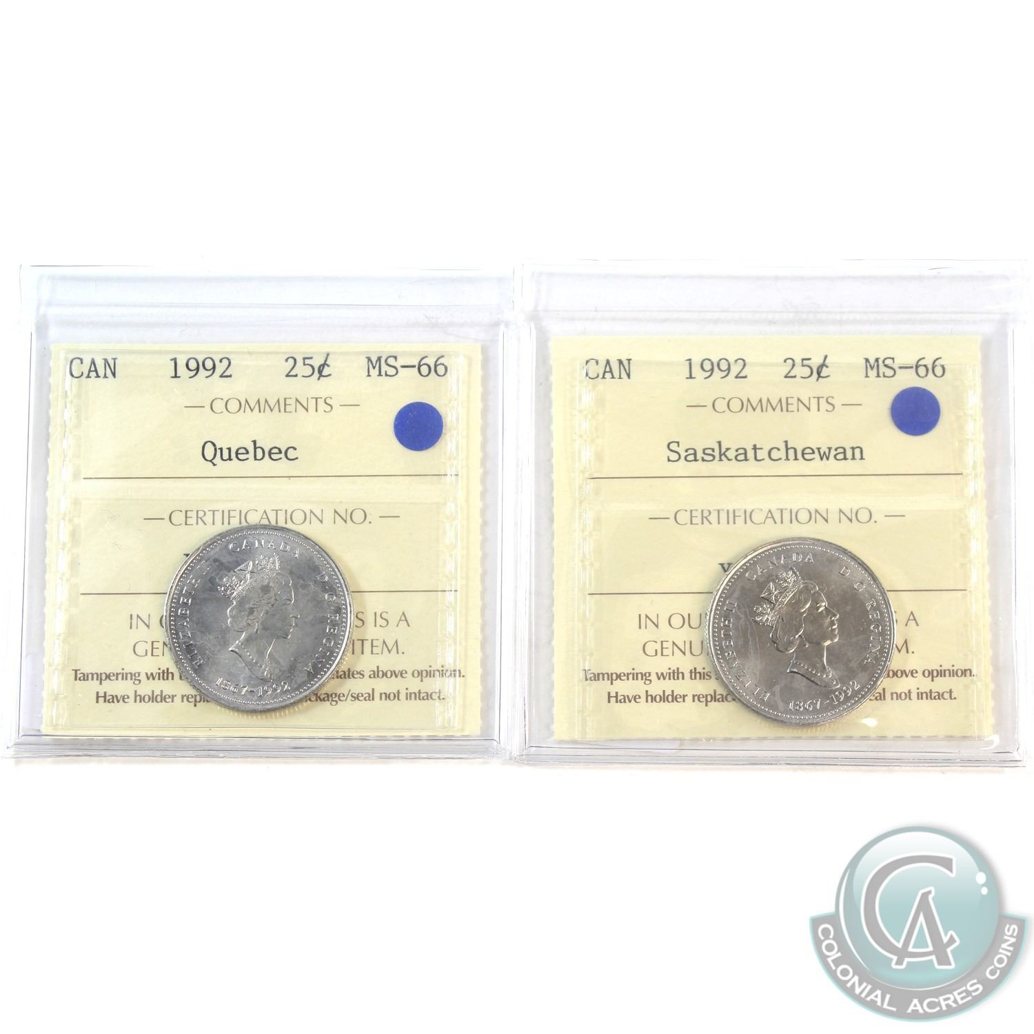 1992 Saskatchewan & 1992 Quebec 25-cent ICCS Certified MS-66. 2pcs