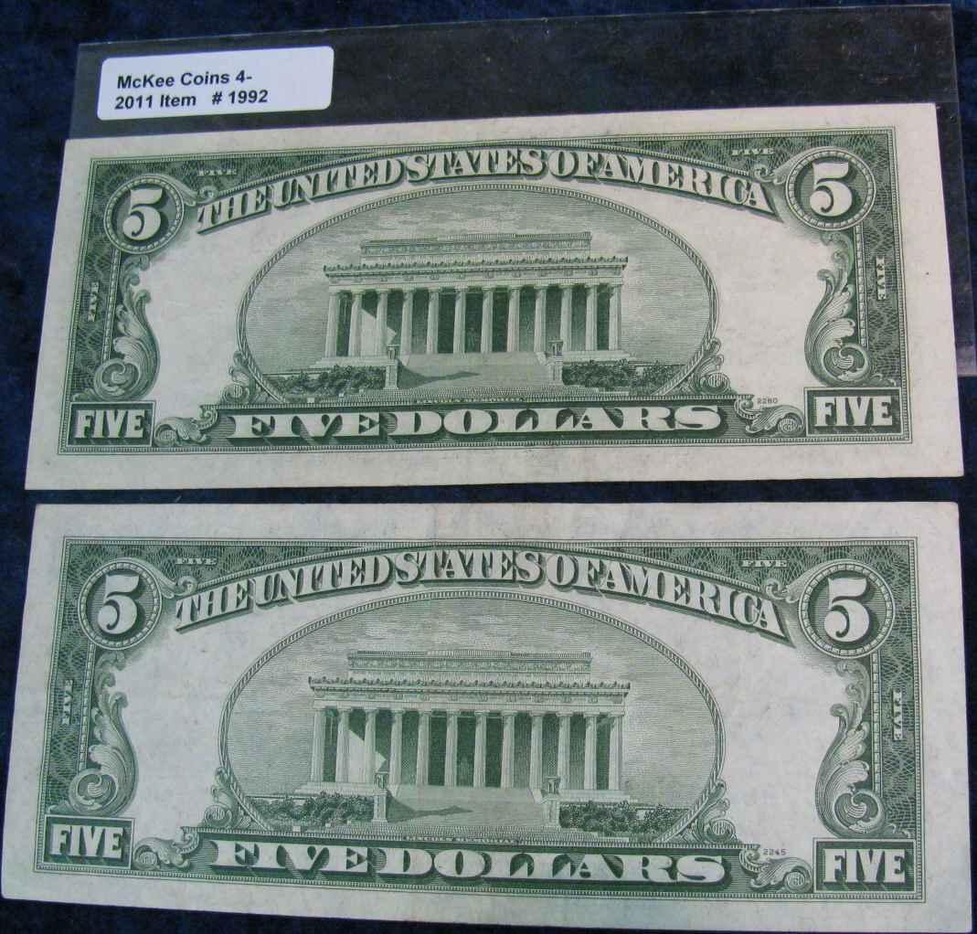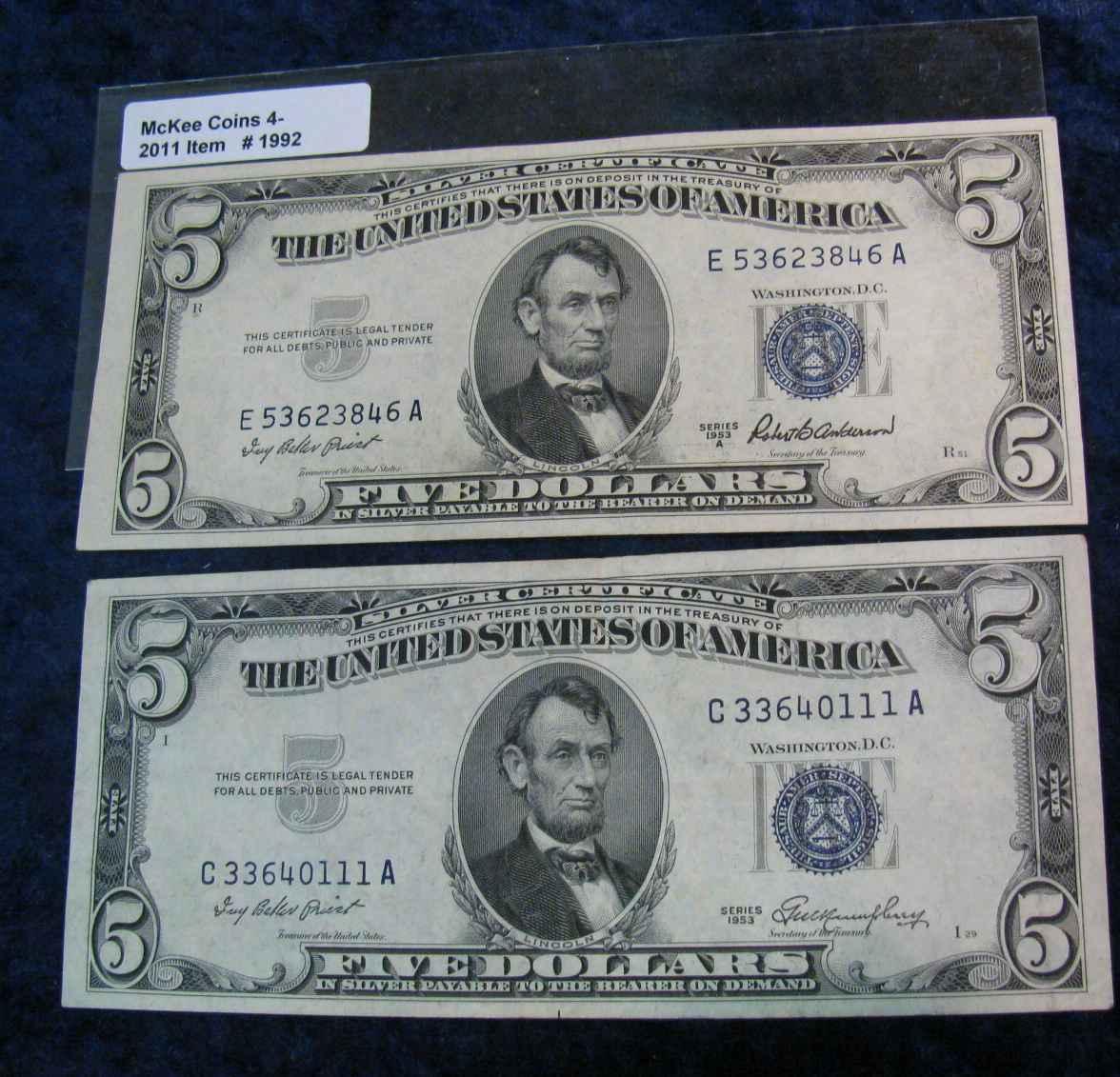 1992. Series 1953 & 53A $5 Silver Certificates. VF.