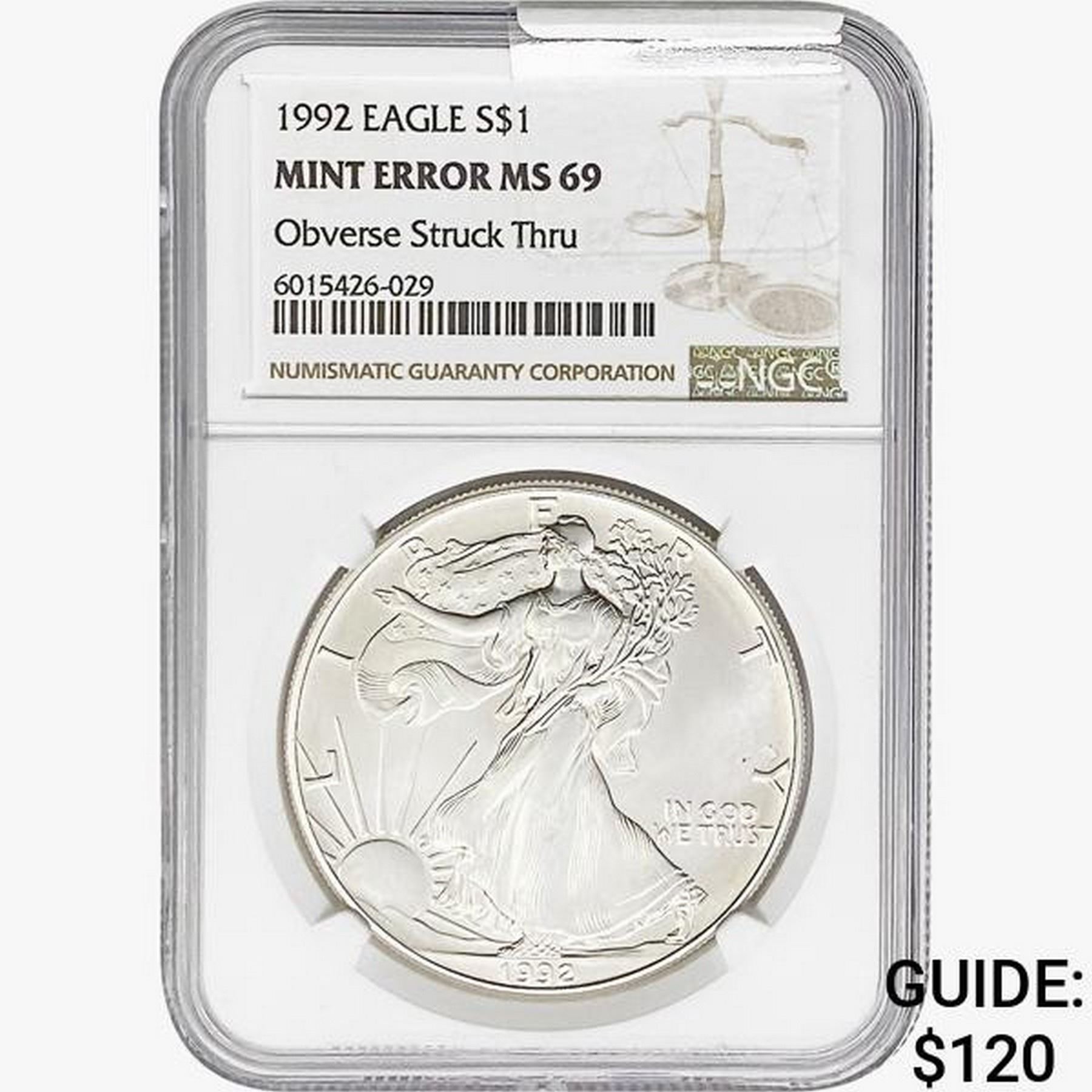 1992 Silver Eagle NGC MS69 OBV Struck Thru Mint Er