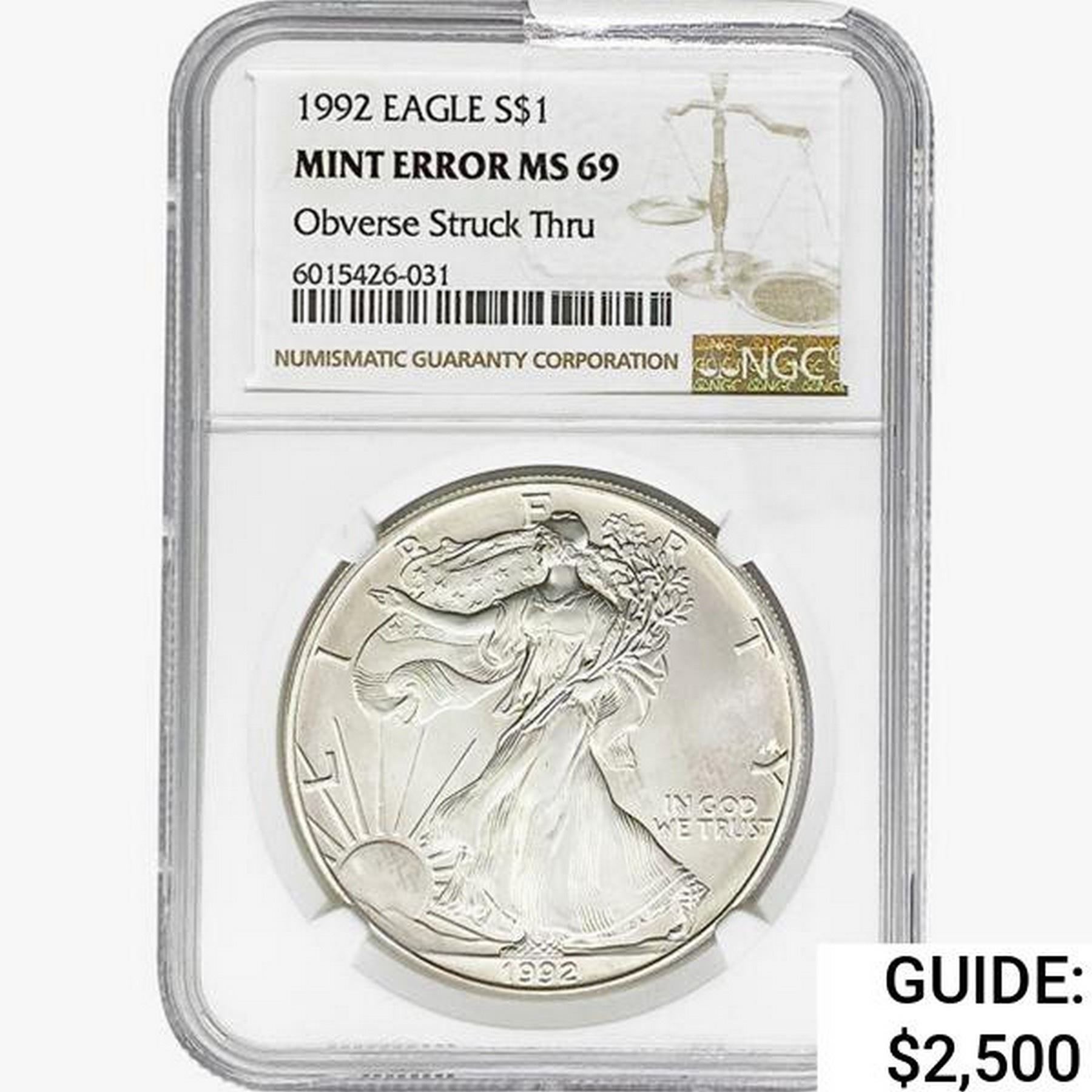 1992 Silver Eagle NGC MS69 OBV Struck Thru Mint Error