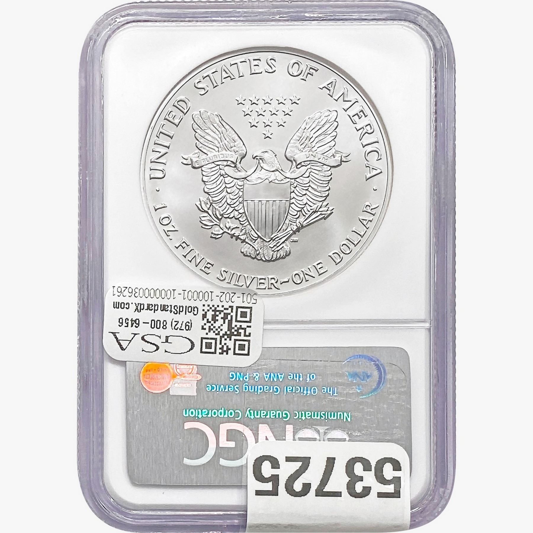 e. Coins sold referencing a third-party grading service are sold “AS IS” without any express or implied warranty, except for a guarantee by GSA that they are genuine. Removal or alteration of the holder, voids all of Bidder’s claims concerning that Product. Certain warranties may be available from the grading services and Bidders are referred to them for further details: Numismatic Guaranty Corporation (NGC), PO Box 4776, Sarasota, FL 34230, www.ngccoin.com/services/writtenguarantee.asp; Professional Coin Grading Services (PCGS), PO Box 9458, Newport Beach, CA 92658, www.pcgs.com/guarantee.html; ANACS, 6555 S. Kenton St., Ste. 303, Englewood, CO 80111; and Independent Coin Grading Co. (ICG), 7901 East Bellview, Ave., Suite 50, Englewood, CO 80111.