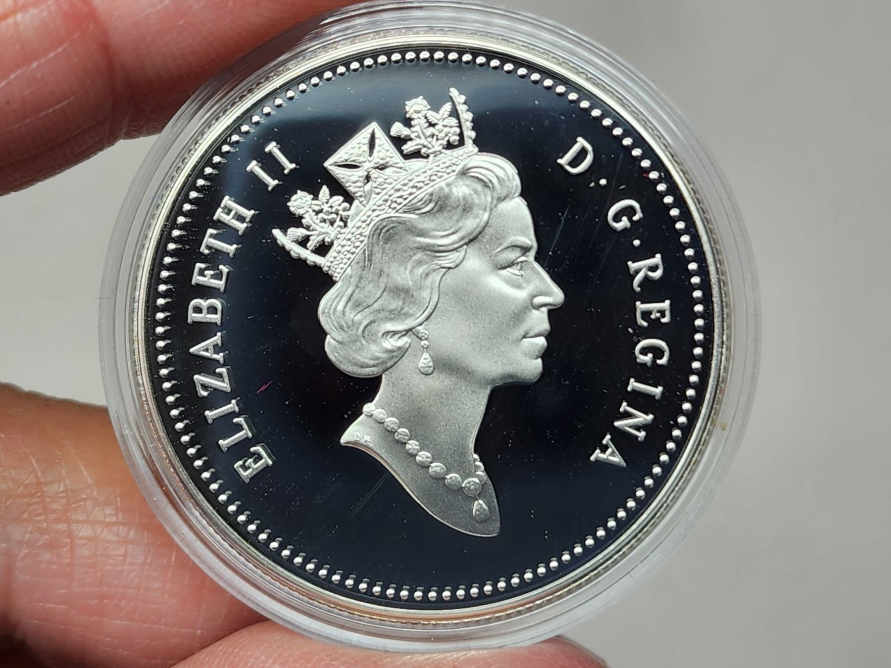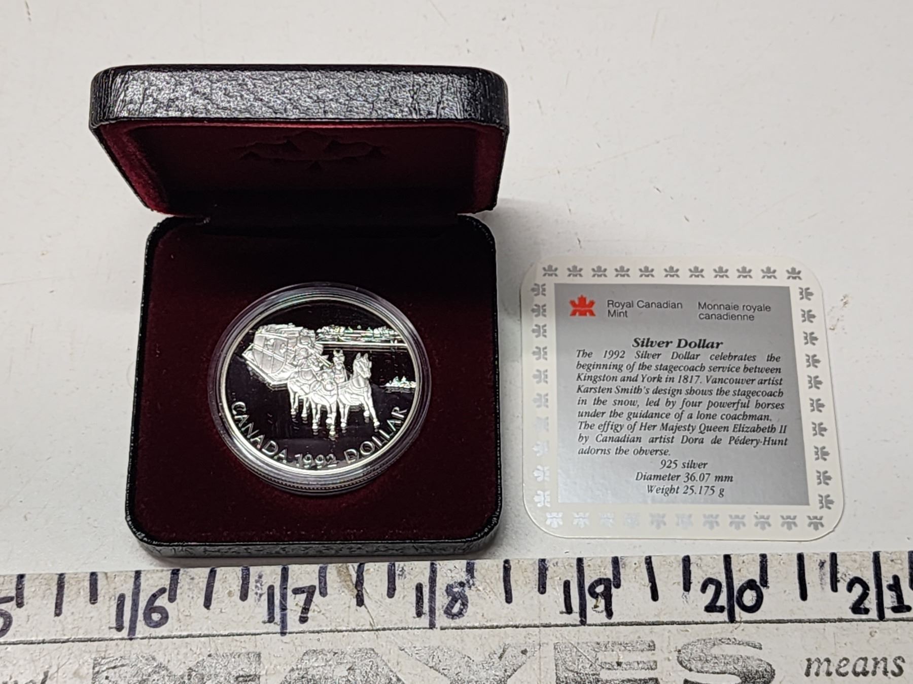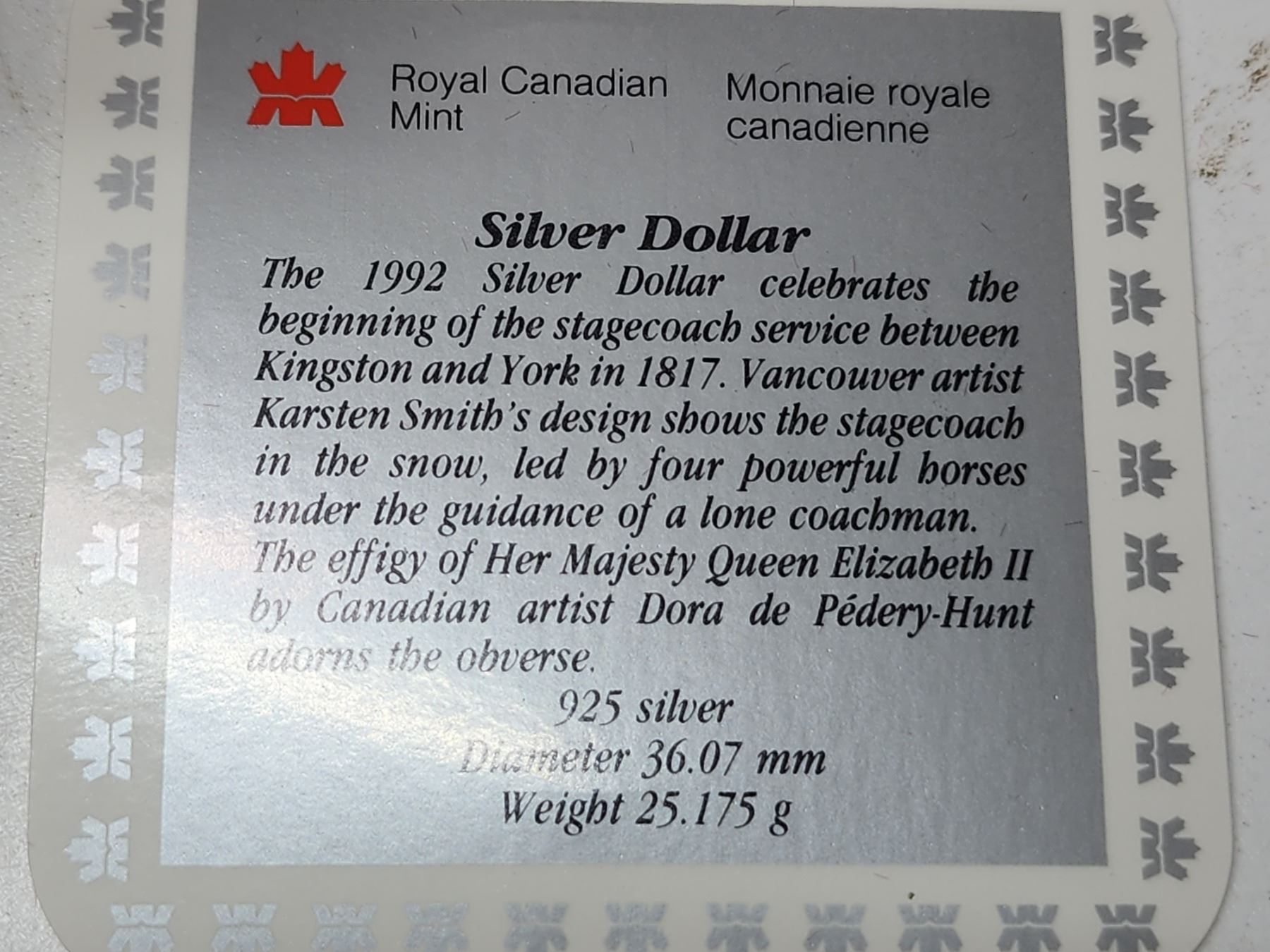 1992 Stagecoach Silver Dollar. Commemorates the first stagecoach between Kingston and York (now Toronto). Proof with Ultra Heavy Cameo. Bright White. Housed in its original RCM case of issue.