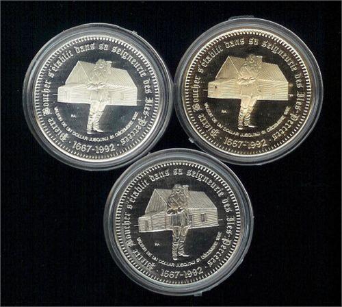 1992 TRADE DOLLAR SET from Boucherville No 0007. Gold, Silver and nickel trade dollars are included. Original box and certificate of issue. Believed to have 10 sets minted.