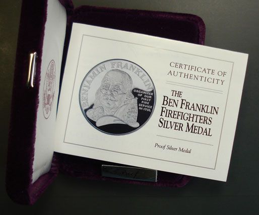 A BEAUTIFUL PROOF MEDAL STRUCK BY THE U.S. MINT, TO HONOR FRANKLINS EFFORTS IN THE FIRE FIGHTING FIELD, ESTIMATE, $50.00 TO $55.00