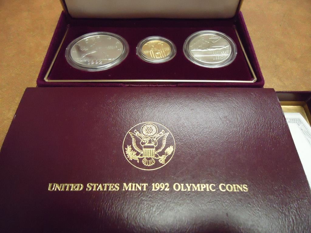 1992-W GOLD $5 COIN, 1992-D BASEBALL SILVER DOLLAR AND 1992-P GYMNAST HALF DOLLAR, ORIGINAL US MINT PACKAGING