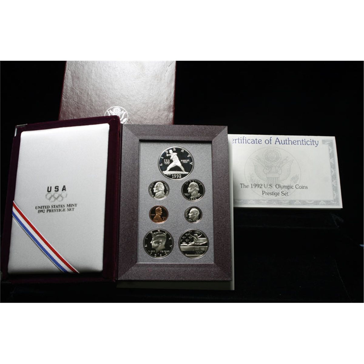 Contains the 1992 Olympic 90% silver US Silver Dollar and the 1992 Olympic Half Dollar plus the Traditional 5 pieces 1992 Proof Set. One of the More Expensive Sets, check out the Price Guides. Includes all the original packaging and the COA. Note* The silver Dollar alone has .7736 Oz. of pure silver. Estimated Value $90