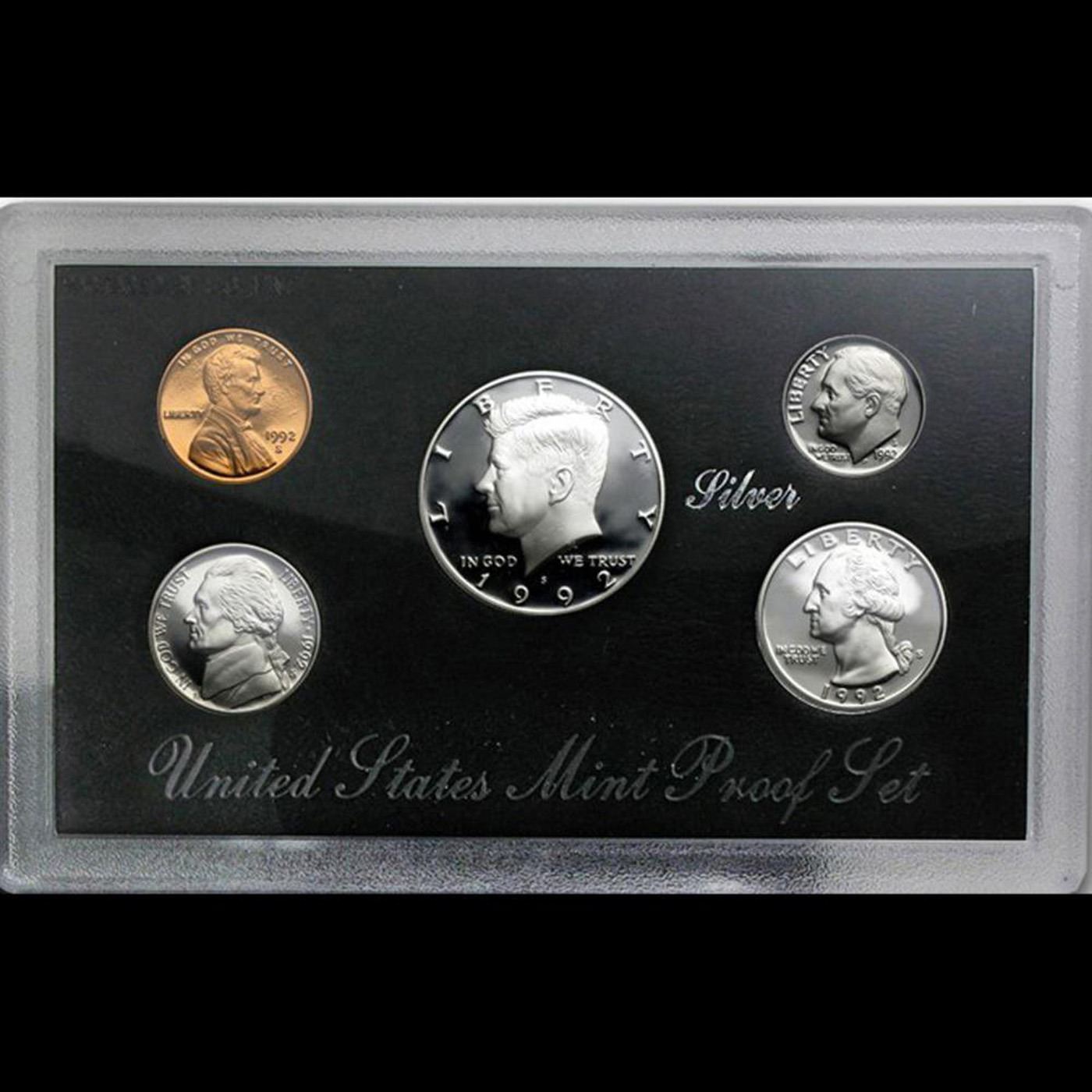 1992 United States Mint Silver Proof Set. 5 Coins Inside. NO BOX or COA. United States Proof Set 1992 5 coins. All coins included in the set were struck at the San Francisco Mint. The set contains a 90% silver Half Dollar, a 90% Silver Quarter, a 90% Silver Dime, a Jefferson Nickel and a Lincoln penny. Harder Set. This set does not have the box or the COA. The coins were placed in individual spaces in a black cardboard. This was sealed within a plastic lens with the word “Silver” imprinted.